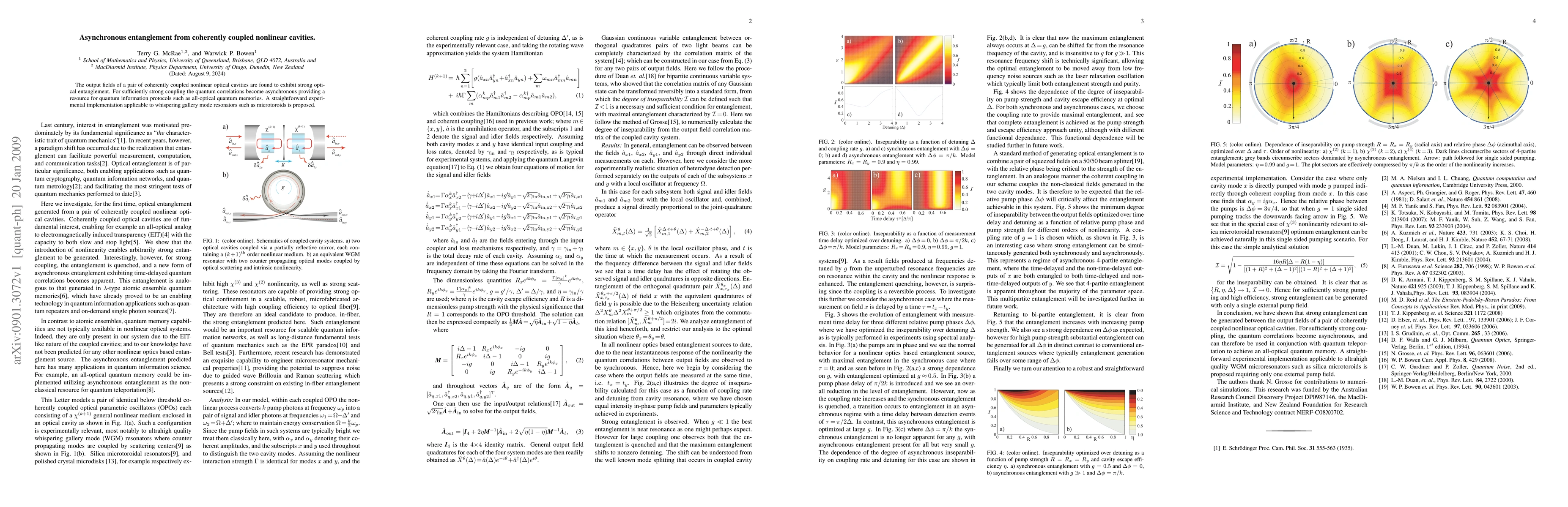 This paper demonstrates strong optical entanglement in coherently coupled nonlinear optical cavities, showing that for strong coupling, the quantum correlations become asynchronous, which can be utilized for quantum information protocols like all-optical quantum memories. An experimental setup using whispering gallery mode resonators, such as microtoroids, is suggested for implementation.