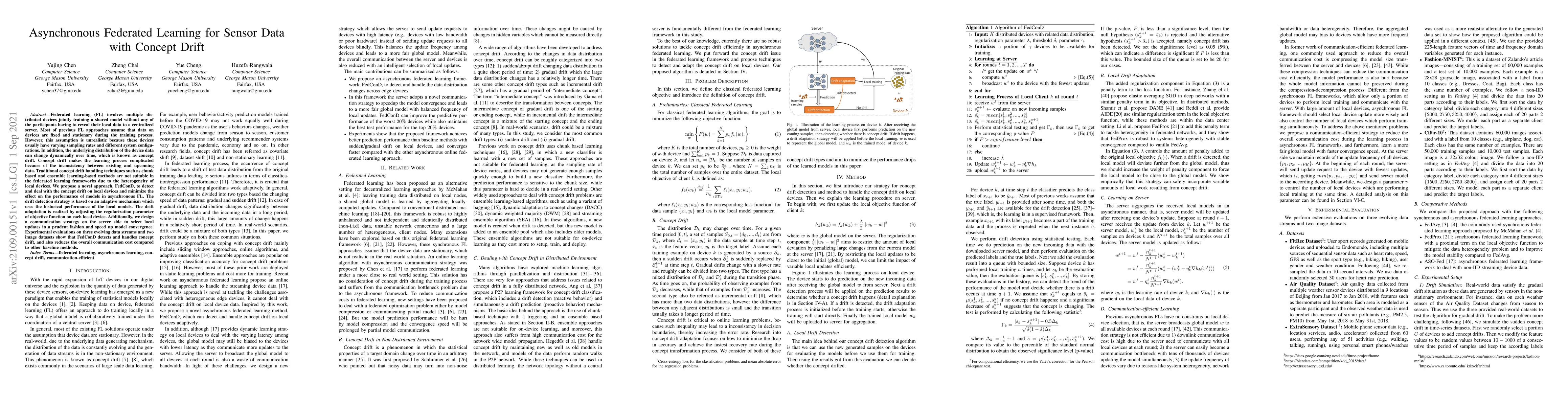This paper proposes FedConD, a novel asynchronous federated learning approach that addresses concept drift in distributed sensor data. It employs adaptive drift detection and regularization adjustments to maintain model performance while minimizing communication costs.