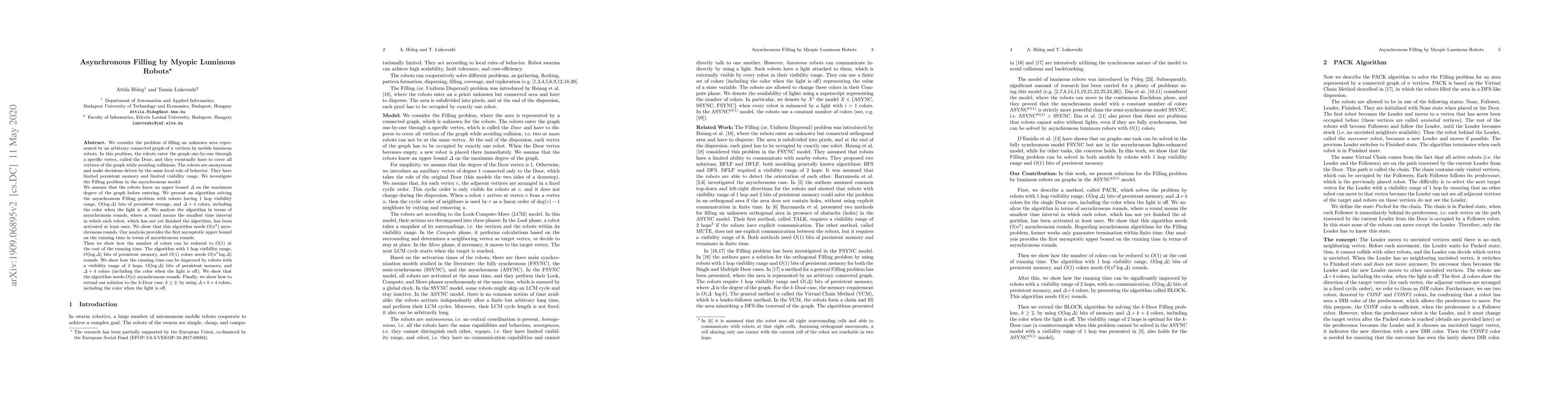 We consider the problem of filling an unknown area represented by an arbitrary connected graph of $n$ vertices by mobile luminous robots. In this problem, the robots enter the graph one-by-one through a specific vertex, called the Door, and they eventually have to cover all vertices of the graph while avoiding collisions. The robots are anonymous and make decisions driven by the same local rule of behavior. They have limited persistent memory and limited visibility range. We investigate the Filling problem in the asynchronous model. We assume that the robots know an upper bound $\Delta$ on the maximum degree of the graph before entering. We present an algorithm solving the asynchronous Filling problem with robots having $1$ hop visibility range, $O(\log\Delta)$ bits of persistent storage, and $\Delta+4$ colors, including the color when the light is off. We analyze the algorithm in terms of asynchronous rounds, where a round means the smallest time interval in which each robot, which has not yet finished the algorithm, has been activated at least once. We show that this algorithm needs $O(n^2)$ asynchronous rounds. Our analysis provides the first asymptotic upper bound on the running time in terms of asynchronous rounds. Then we show how the number of colors can be reduced to $O(1)$ at the cost of the running time. The algorithm with $1$ hop visibility range, $O(\log \Delta)$ bits of persistent memory, and $O(1)$ colors needs $O(n^2\log \Delta)$ rounds. We show how the running time can be improved by robots with a visibility range of $2$ hops, $O(\log \Delta)$ bits of persistent memory, and $\Delta + 4$ colors (including the color when the light is off). We show that the algorithm needs $O(n)$ asynchronous rounds. Finally, we show how to extend our solution to the $k$-Door case, $k\geq 2$, by using $\Delta + k + 4$ colors, including the color when the light is off.