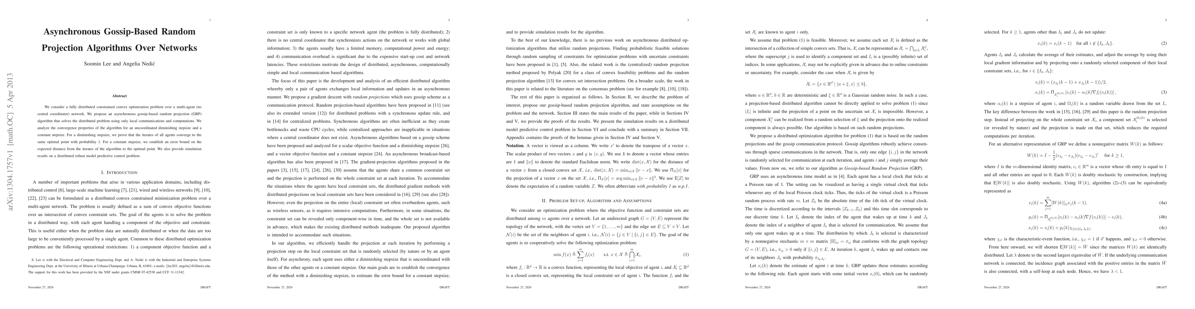 This paper proposes an asynchronous gossip-based random projection algorithm for solving distributed constrained convex optimization problems in multi-agent networks. It analyzes convergence properties under diminishing and constant stepsizes, proving convergence and providing error bounds, and demonstrates effectiveness through simulation in a distributed robust model predictive control scenario.