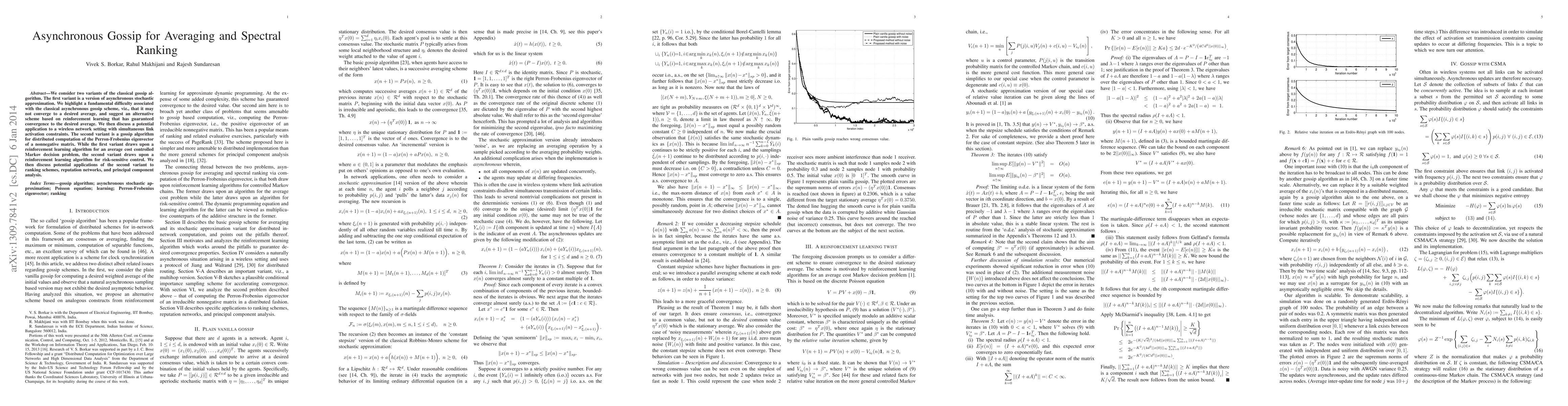This paper proposes two asynchronous gossip algorithm variants: one for guaranteed convergence in averaging problems using reinforcement learning, and another for distributed computation of the Perron-Frobenius eigenvector, with applications to ranking, reputation networks, and principal component analysis.