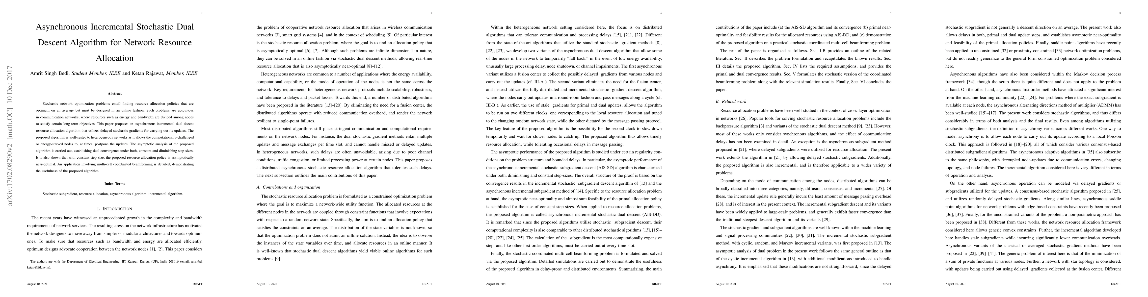 This paper proposes an asynchronous incremental stochastic dual descent algorithm for network resource allocation, allowing nodes to defer updates. The algorithm achieves dual convergence and near-optimality, demonstrated through an application in multi-cell coordinated beamforming.