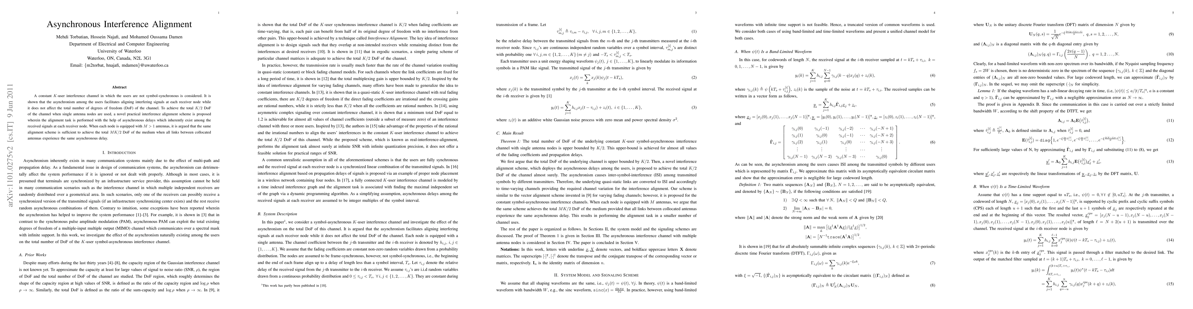 Researchers propose a new interference alignment scheme that utilizes asynchronous delays to align interfering signals at each receiver node, achieving the channel's total K/2 DoF. This approach is practical for single antenna nodes and collocated antennas with M > 1.