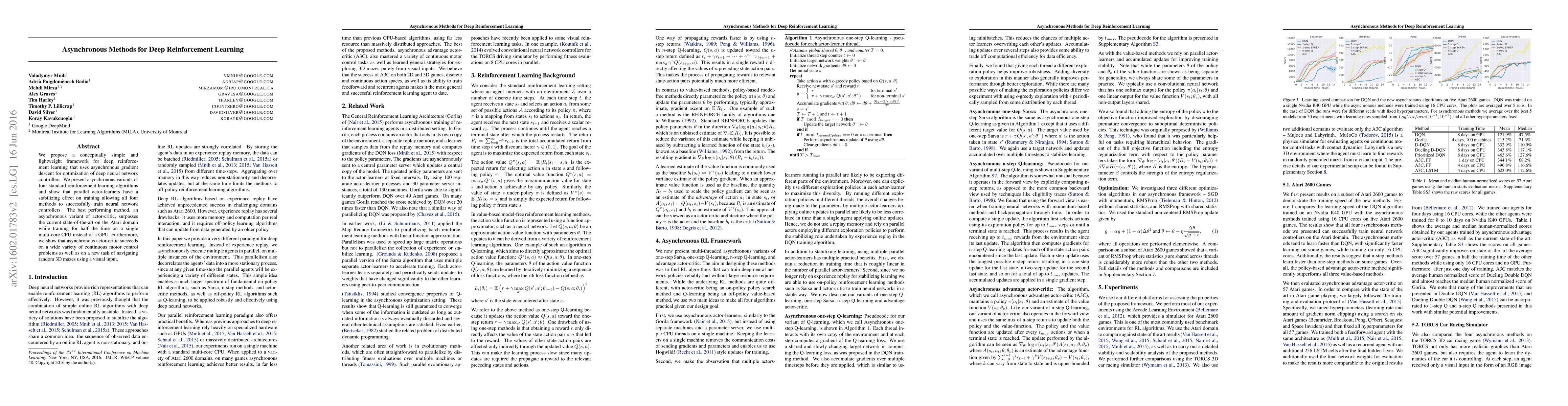 We propose a conceptually simple and lightweight framework for deep reinforcement learning that uses asynchronous gradient descent for optimization of deep neural network controllers. We present asynchronous variants of four standard reinforcement learning algorithms and show that parallel actor-learners have a stabilizing effect on training allowing all four methods to successfully train neural network controllers. The best performing method, an asynchronous variant of actor-critic, surpasses the current state-of-the-art on the Atari domain while training for half the time on a single multi-core CPU instead of a GPU. Furthermore, we show that asynchronous actor-critic succeeds on a wide variety of continuous motor control problems as well as on a new task of navigating random 3D mazes using a visual input.