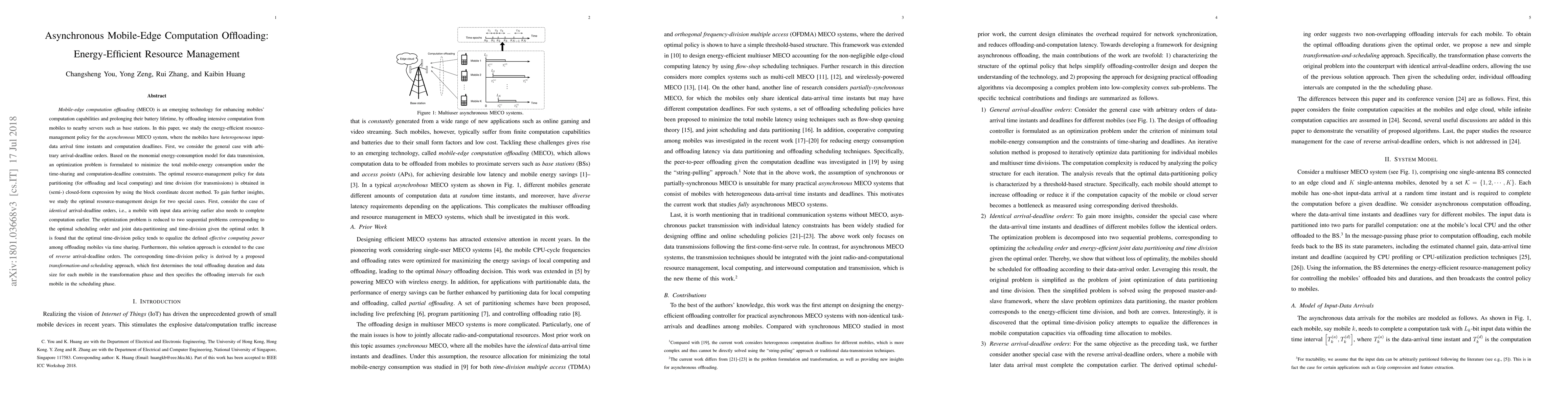 This paper explores energy-efficient resource management for asynchronous mobile-edge computation offloading, focusing on minimizing total mobile energy consumption under computation deadlines. The optimal policy for data partitioning and time division is derived using block coordinate descent, with special insights gained for identical and reverse arrival-deadline orders through transformation-and-scheduling approaches.