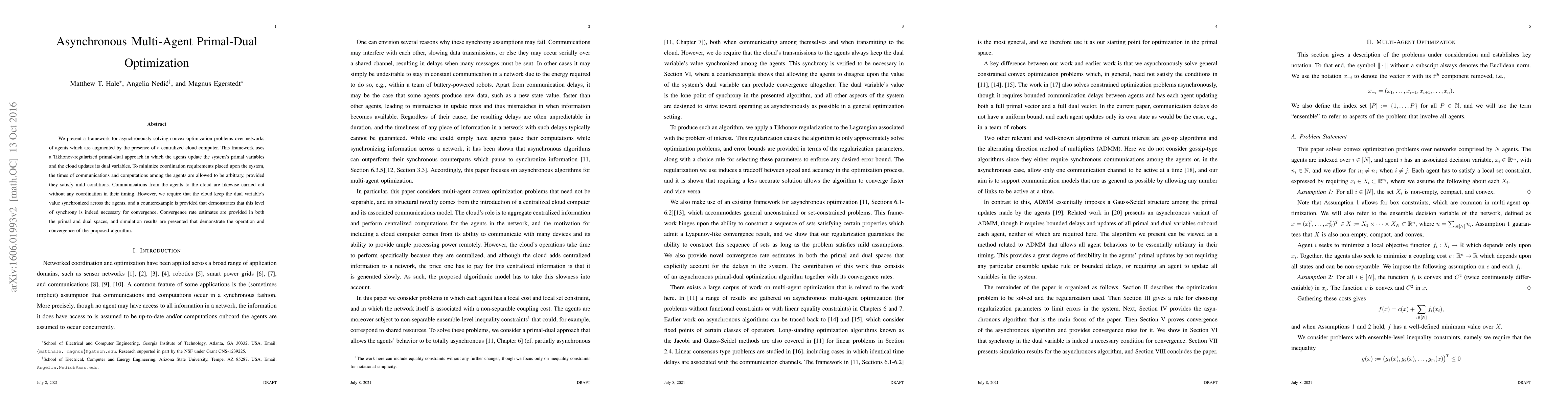 This research paper proposes an asynchronous framework for multi-agent optimization problems using primal-dual approach, allowing agents to update variables without coordination, while the cloud updates dual variables in a synchronized manner.