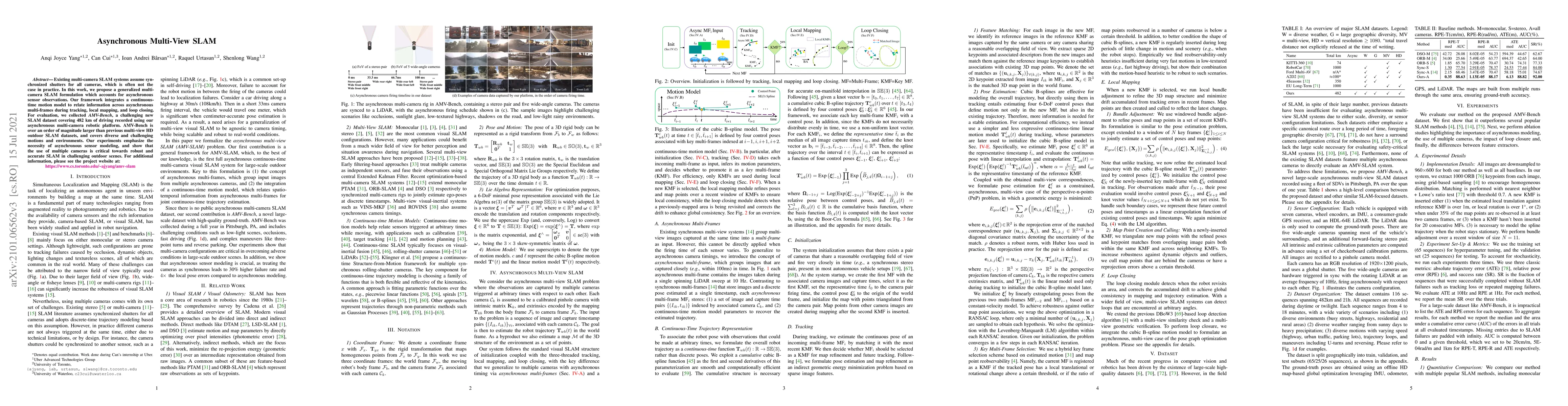 This paper proposes a generalized asynchronous multi-camera SLAM framework that accounts for unsynchronized camera shutters, integrating a continuous-time motion model for tracking and mapping. The authors introduce AMV-Bench, a large-scale dataset for evaluating their method, demonstrating the importance of asynchronous sensor modeling for robust outdoor SLAM.
