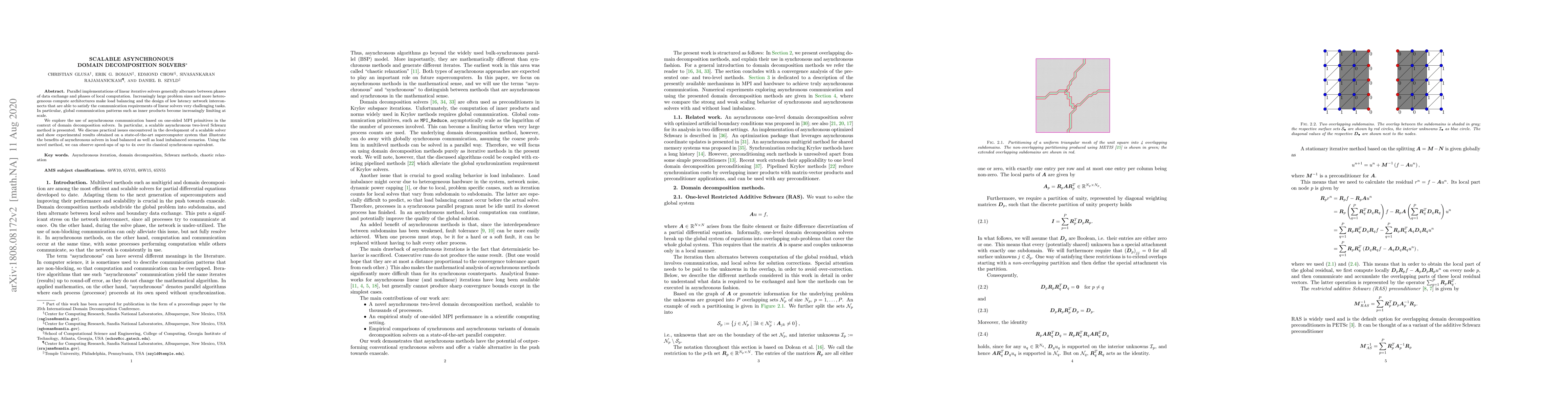 Parallel implementations of linear iterative solvers generally alternate between phases of data exchange and phases of local computation. Increasingly large problem sizes on more heterogeneous systems make load balancing and network layout very challenging tasks. In particular, global communication patterns such as inner products become increasingly limiting at scale. We explore the use of asynchronous communication based on one-sided MPI primitives in a multitude of domain decomposition solvers. In particular, a scalable asynchronous two-level method is presented. We discuss practical issues encountered in the development of a scalable solver and show experimental results obtained on state-of-the-art supercomputer systems that illustrate the benefits of asynchronous solvers in load balanced as well as load imbalanced scenarios. Using the novel method, we can observe speed-ups of up to 4x over its classical synchronous equivalent.
