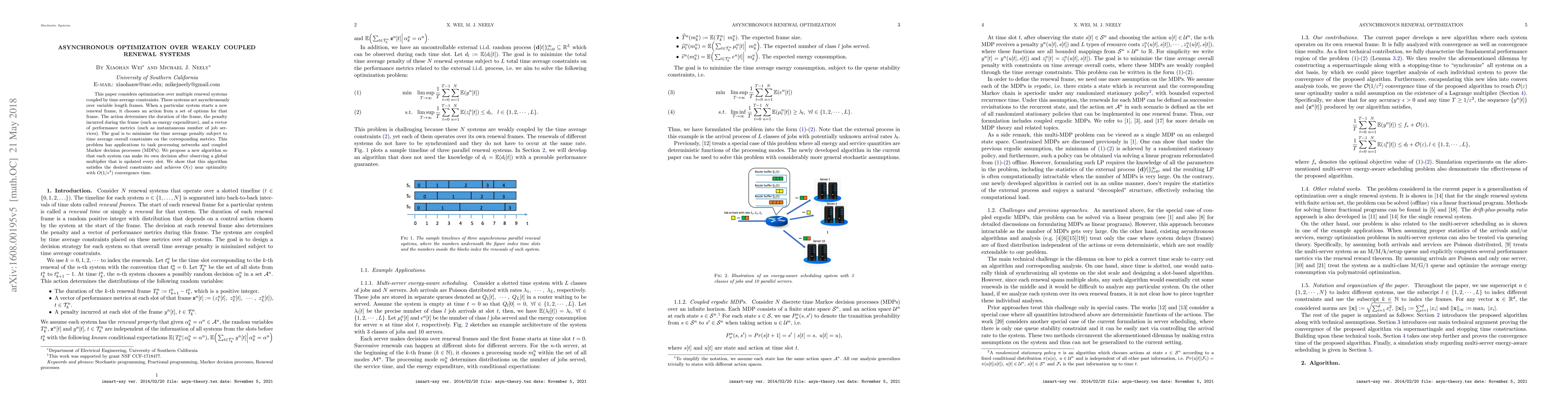 A distributed algorithm is proposed to optimize multiple renewal systems with asynchronous updates, achieving near-optimality while satisfying time average constraints. The algorithm converges in $rac{1}{m{m{m{m{m{m{m{m{m{m{m{m{m{m{m{m{m{m{m{m{m{m{m{m{m{m{m{m{m{m{m{m{m{m{ m{ m{ m{ m{ } }}}}}}}}}}}}}}}$ time.