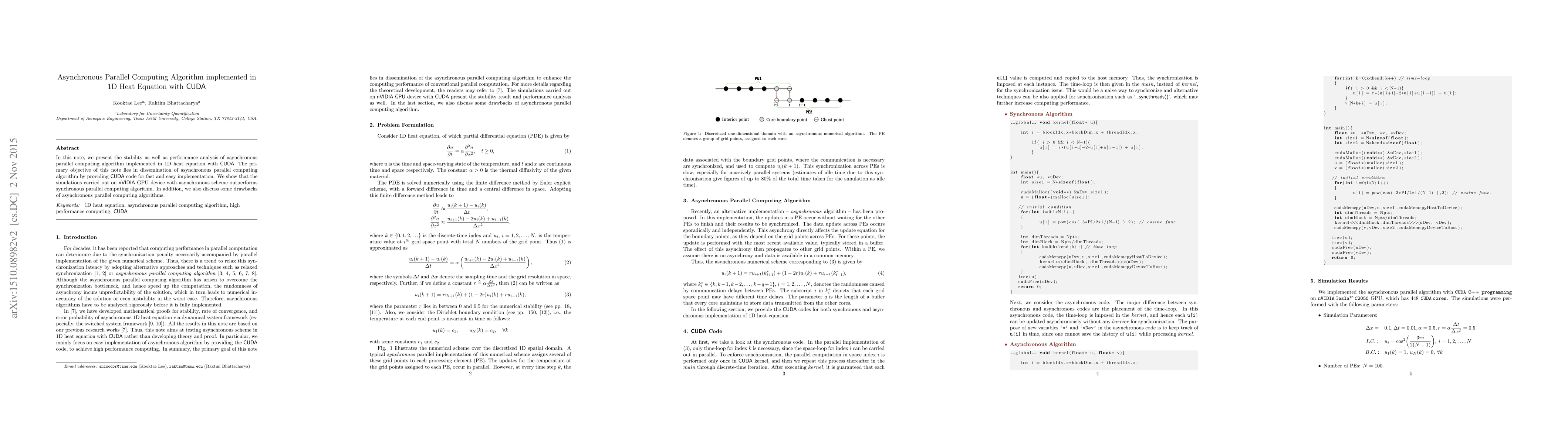 This paper presents an asynchronous parallel computing algorithm for solving the 1D heat equation using CUDA, demonstrating its stability and performance. Simulations on an nVIDIA GPU show that the asynchronous scheme outperforms synchronous methods, though the paper also notes some inherent drawbacks of the asynchronous approach.