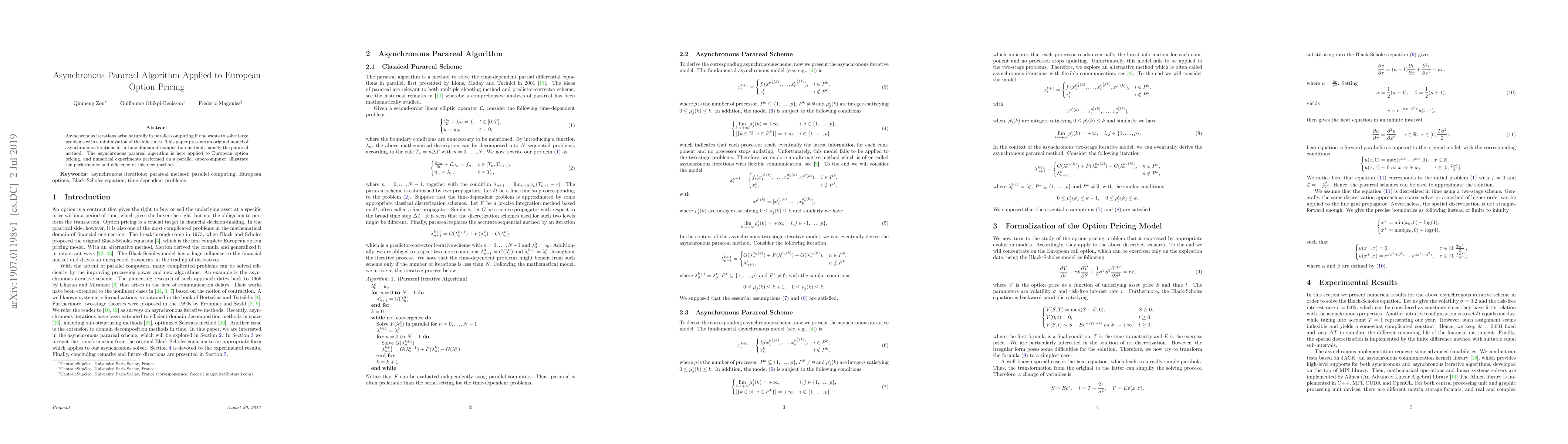 This paper introduces an asynchronous parareal algorithm for European option pricing, demonstrating its efficiency through parallel computing on a supercomputer, with numerical experiments highlighting its performance benefits.