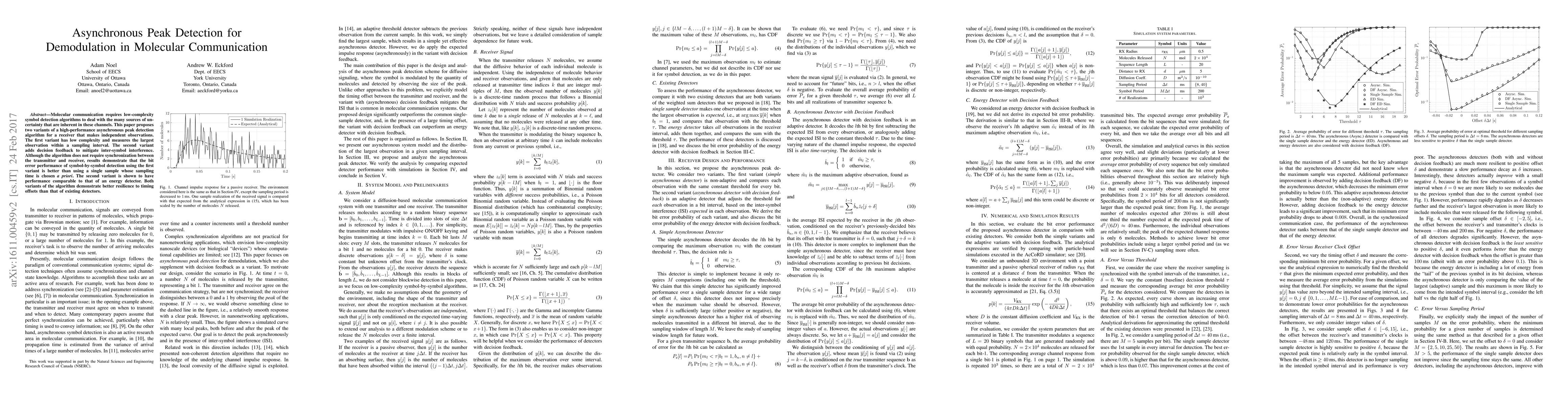 This paper proposes two low-complexity asynchronous peak detection algorithms for molecular communication receivers, showing improved bit error performance and resilience to timing offsets compared to existing detectors. The first variant focuses on simplicity, while the second incorporates decision feedback to mitigate inter-symbol interference.