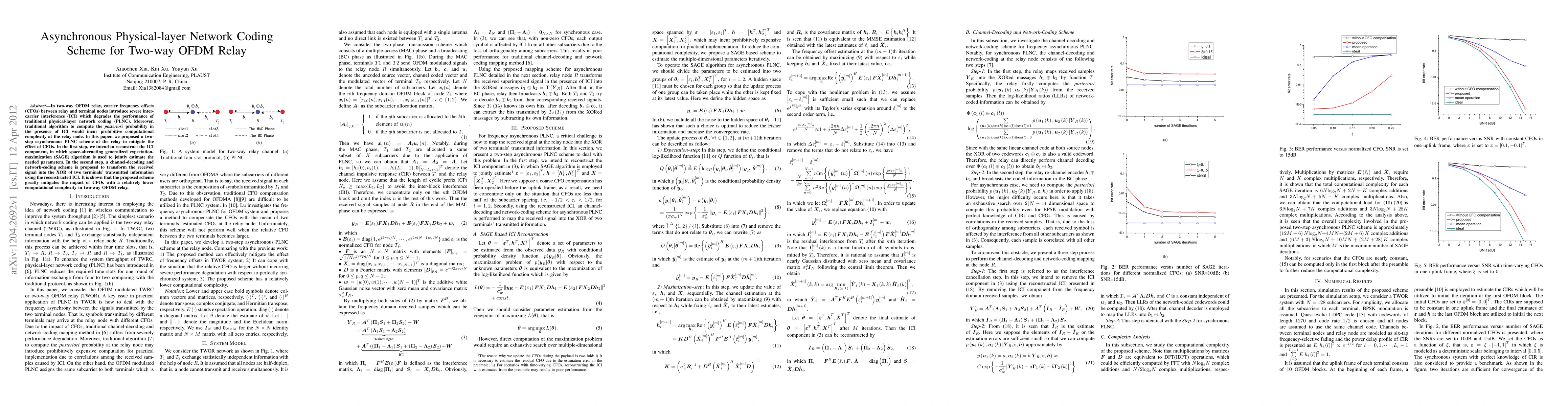 This paper proposes an asynchronous physical-layer network coding scheme for two-way OFDM relay that mitigates the impact of carrier frequency offsets (CFOs) using a two-step approach: first reconstructing intercarrier interference (ICI) with a SAGE algorithm, and second applying channel-decoding and network-coding to transform received signals into the XOR of transmitted information, achieving better performance with lower computational complexity.