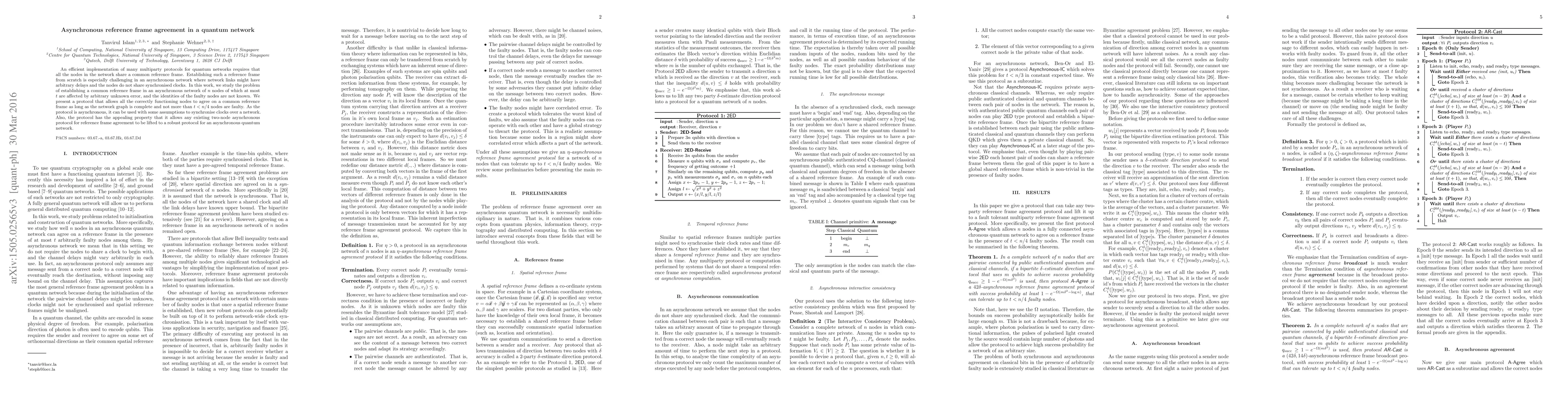 This paper proposes an asynchronous protocol for establishing a common reference frame in a quantum network where nodes may have arbitrary delays and lack synchronized clocks. The protocol ensures agreement among functioning nodes even if up to $t<n/4$ nodes are faulty, enhancing the robustness of multiparty quantum protocols.
