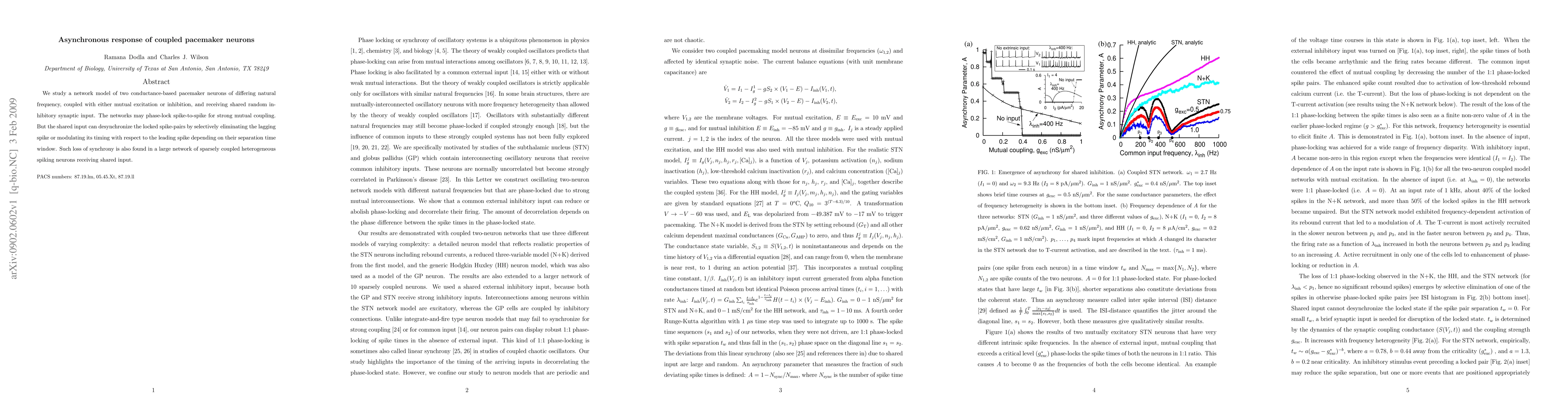 This paper explores a network model of two pacemaker neurons with differing natural frequencies, showing how mutual coupling and shared random inhibitory input can lead to asynchronous responses, even when spike-to-spike phase-locking occurs, due to selective elimination or timing modulation of lagging spikes. The findings extend to larger networks of heterogeneous neurons.