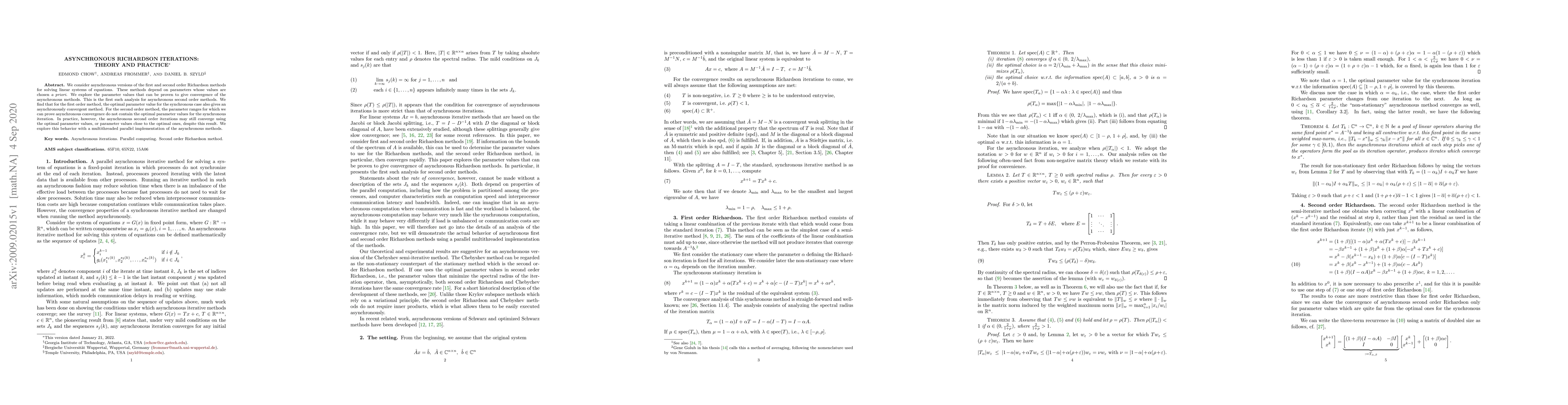 This paper investigates asynchronous versions of first and second order Richardson methods for solving linear systems, focusing on parameter values that ensure convergence. It finds that the optimal synchronous parameter works for the first order method but not for the second order method, though practical convergence may still occur with optimal parameters.