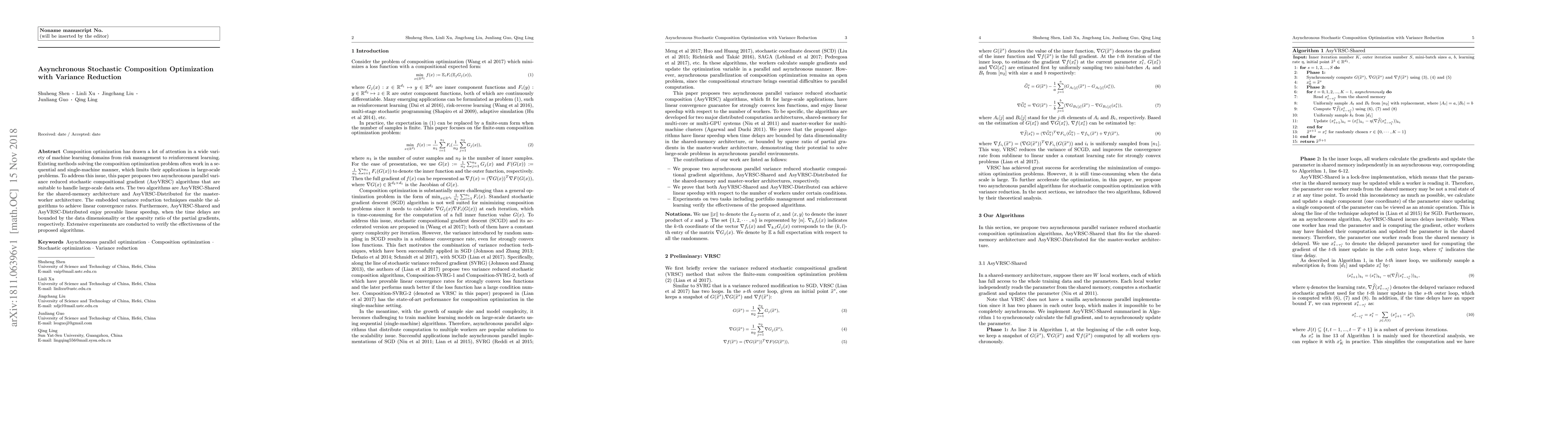 This paper proposes two asynchronous parallel variance reduced stochastic compositional gradient algorithms, AsyVRSC-Shared and AsyVRSC-Distributed, for solving large-scale composition optimization problems. The algorithms achieve linear convergence rates and provable linear speedup under certain conditions, with extensive experiments validating their effectiveness.