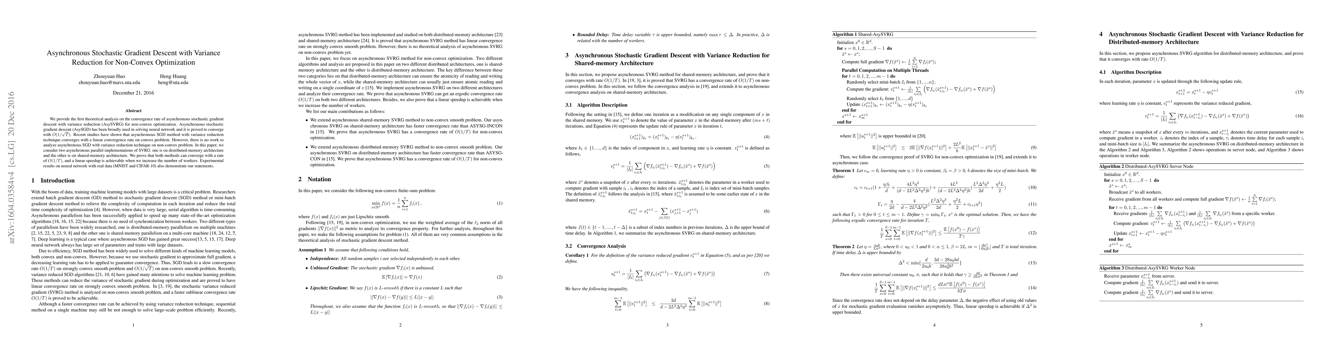 This paper provides the first theoretical analysis of the convergence rate of asynchronous stochastic variance reduced gradient (SVRG) descent for non-convex optimization. It demonstrates that both distributed and shared memory implementations of asynchronous SVRG achieve a convergence rate of $O(1/T)$ and linear speed up with a bounded number of workers.
