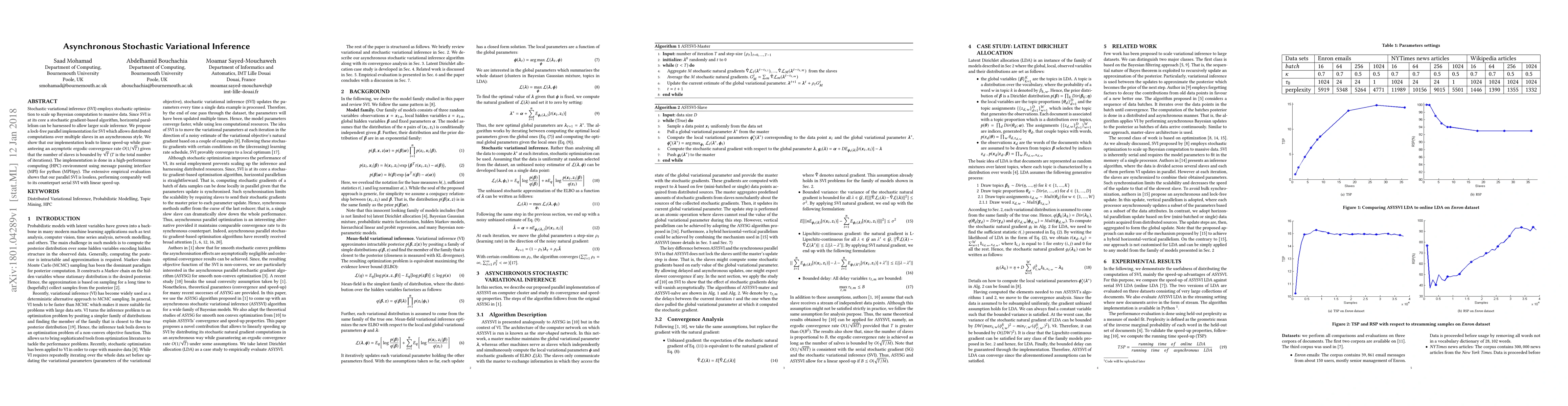 This paper proposes a lock-free, asynchronous parallel implementation of stochastic variational inference (SVI) using MPI4py in an HPC environment, achieving linear speed-up with asymptotic convergence. The method scales well with the number of distributed slaves, maintaining performance comparable to serial SVI.