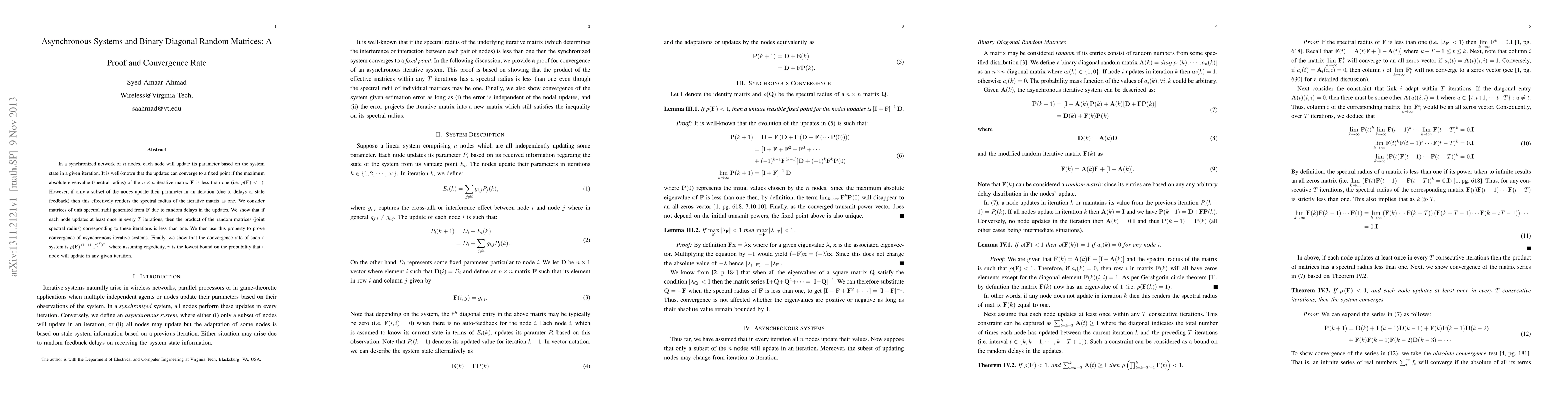 In a synchronized network of $n$ nodes, each node will update its parameter based on the system state in a given iteration. It is well-known that the updates can converge to a fixed point if the maximum absolute eigenvalue (spectral radius) of the $n \times n$ iterative matrix ${\bf{F}}$ is less than one (i.e. $\rho({\bf{F}})<1$). However, if only a subset of the nodes update their parameter in an iteration (due to delays or stale feedback) then this effectively renders the spectral radius of the iterative matrix as one. We consider matrices of unit spectral radii generated from ${\bf{F}}$ due to random delays in the updates. We show that if each node updates at least once in every $T$ iterations, then the product of the random matrices (joint spectral radius) corresponding to these iterations is less than one. We then use this property to prove convergence of asynchronous iterative systems. Finally, we show that the convergence rate of such a system is $\rho({\bf{F}})\frac{(1-(1-\gamma)^T)^n}{T}$, where assuming ergodicity, $\gamma$ is the lowest bound on the probability that a node will update in any given iteration.