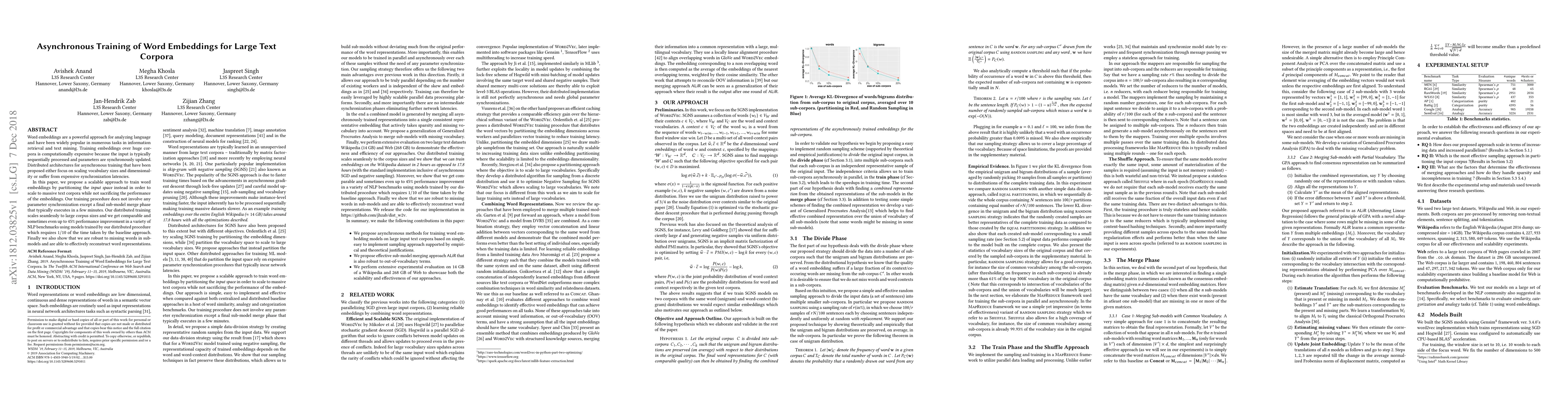 This paper proposes a scalable distributed method for training word embeddings on large text corpora by partitioning the input space, which avoids expensive synchronization and achieves performance improvements up to 45% in NLP benchmarks while requiring only 1/10th of the time of the baseline approach.