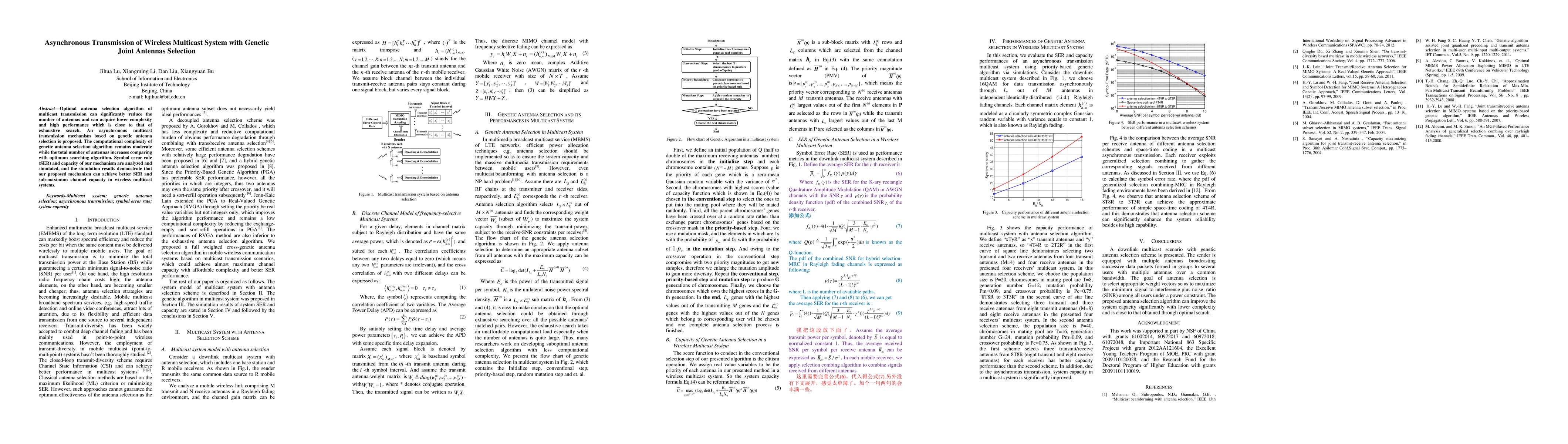This paper proposes an asynchronous multicast transmission mechanism using a genetic algorithm for joint antenna selection, aiming to reduce complexity and improve performance. Simulation results show that the method achieves better symbol error rate and sub-maximum channel capacity compared to exhaustive search algorithms.