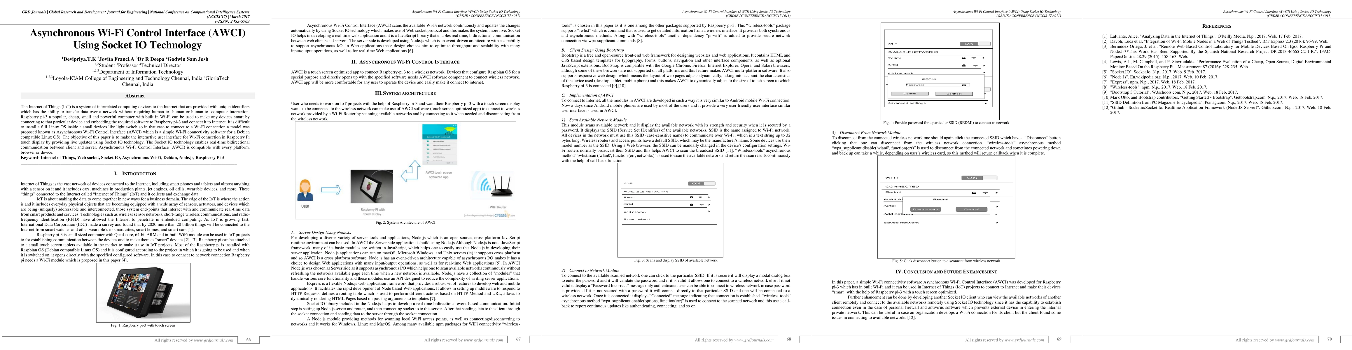 The Internet of Things (IoT) is a system of interrelated computing devices to the Internet that are provided with unique identifiers which has the ability to transfer data over a network without requiring human-to- human or human-to- computer interaction. Raspberry pi-3 a popular, cheap, small and powerful computer with built in Wi-Fi can be used to make any devices smart by connecting to that particular device and embedding the required software to Raspberry pi-3 and connect it to Internet. It is difficult to install a full Linux OS inside a small devices like light switch so in that case to connect to a Wi-Fi connection a model was proposed known as Asynchronous Wi-Fi Control Interface (AWCI) which is a simple Wi-Fi connectivity software for a Debian compatible Linux OS). The objective of this paper is to make the interactive user interface for Wi-Fi connection in Raspberry Pi touch display by providing live updates using Socket IO technology. The Socket IO technology enables real-time bidirectional communication between client and server. Asynchronous Wi-Fi Control Interface (AWCI) is compatible with every platform, browser or device.