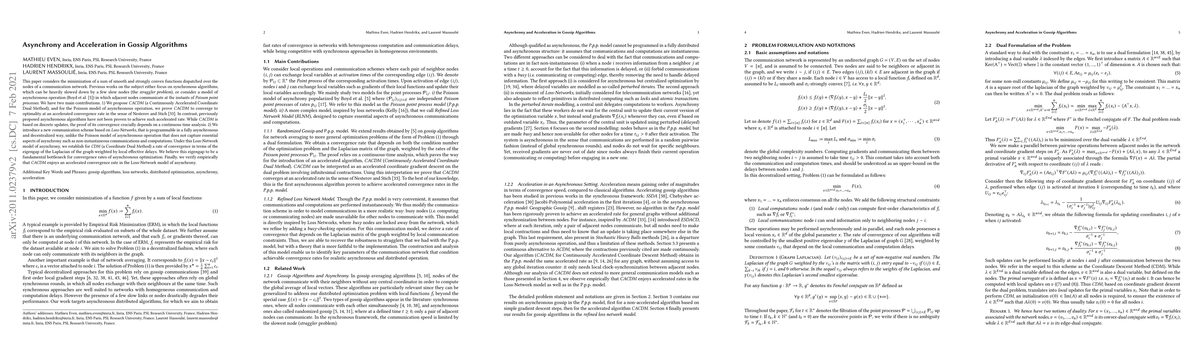 This paper considers the minimization of a sum of smooth and strongly convex functions dispatched over the nodes of a communication network. Previous works on the subject either focus on synchronous algorithms, which can be heavily slowed down by a few slow nodes (the straggler problem), or consider a model of asynchronous operation (Boyd et al., 2006) in which adjacent nodes communicate at the instants of Poisson point processes. We have two main contributions. 1) We propose CACDM (a Continuously Accelerated Coordinate Dual Method), and for the Poisson model of asynchronous operation, we prove CACDM to converge to optimality at an accelerated convergence rate in the sense of Nesterov et Stich, 2017. In contrast, previously proposed asynchronous algorithms have not been proven to achieve such accelerated rate. While CACDM is based on discrete updates, the proof of its convergence crucially depends on a continuous time analysis. 2) We introduce a new communication scheme based on Loss-Networks, that is programmable in a fully asynchronous and decentralized way, unlike the Poisson model of asynchronous operation that does not capture essential aspects of asynchrony such as non-instantaneous communications and computations. Under this Loss-Network model of asynchrony, we establish for CDM (a Coordinate Dual Method) a rate of convergence in terms of the eigengap of the Laplacian of the graph weighted by local effective delays. We believe this eigengap to be a fundamental bottleneck for convergence rates of asynchronous optimization. Finally, we verify empirically that CACDM enjoys an accelerated convergence rate in the Loss-Network model of asynchrony.