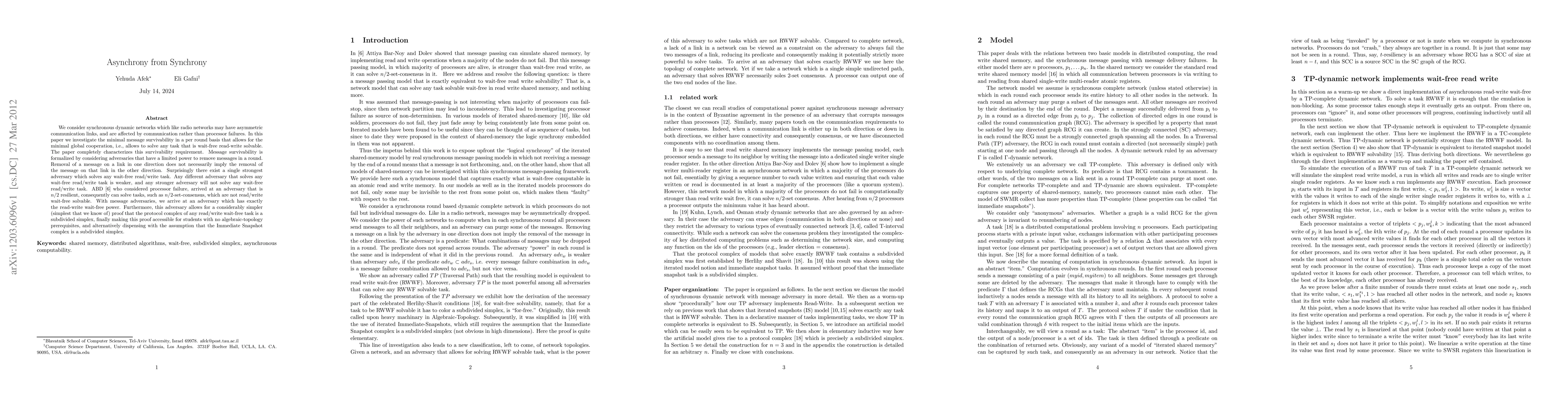 We consider synchronous dynamic networks which like radio networks may have asymmetric communication links, and are affected by communication rather than processor failures. In this paper we investigate the minimal message survivability in a per round basis that allows for the minimal global cooperation, i.e., allows to solve any task that is wait-free read-write solvable. The paper completely characterizes this survivability requirement. Message survivability is formalized by considering adversaries that have a limited power to remove messages in a round. Removal of a message on a link in one direction does not necessarily imply the removal of the message on that link in the other direction. Surprisingly there exist a single strongest adversary which solves any wait-free read/write task. Any different adversary that solves any wait-free read/write task is weaker, and any stronger adversary will not solve any wait-free read/write task. ABD \cite{ABD} who considered processor failure, arrived at an adversary that is $n/2$ resilient, consequently can solve tasks, such as $n/2$-set-consensus, which are not read/write wait-free solvable. With message adversaries, we arrive at an adversary which has exactly the read-write wait-free power. Furthermore, this adversary allows for a considerably simpler (simplest that we know of) proof that the protocol complex of any read/write wait-free task is a subdivided simplex, finally making this proof accessible for students with no algebraic-topology prerequisites, and alternatively dispensing with the assumption that the Immediate Snapshot complex is a subdivided simplex.