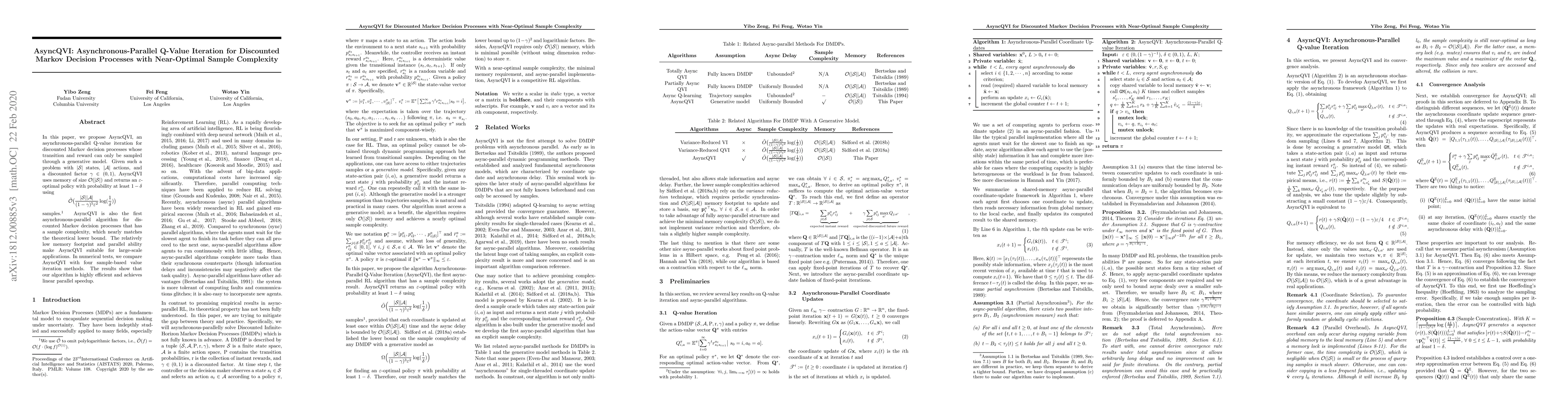 AsyncQVI is an asynchronous-parallel Q-value iteration algorithm for discounted Markov decision processes that achieves near-optimal sample complexity with a memory footprint of $\mathcal{O}(|\mathcal{S}|)$. It demonstrates linear parallel speedup and nearly matches theoretical lower bounds on sample complexity.