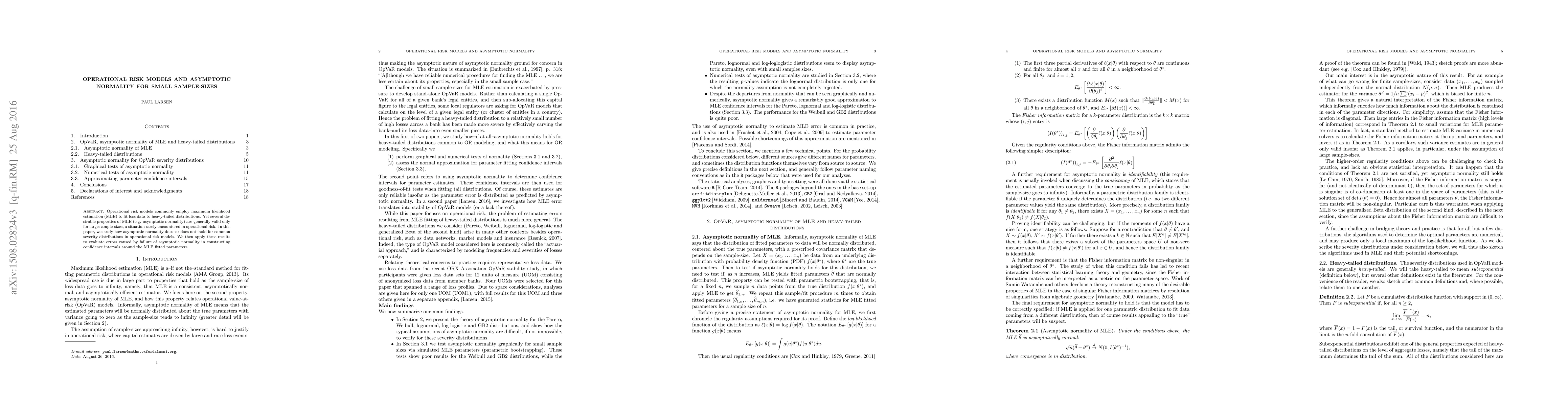 This paper investigates the asymptotic normality of maximum likelihood estimation (MLE) in operational risk models, which often use heavy-tailed distributions. It examines the validity of MLE's desirable properties under small sample sizes typical in operational risk and assesses the impact of non-normality on confidence interval accuracy.