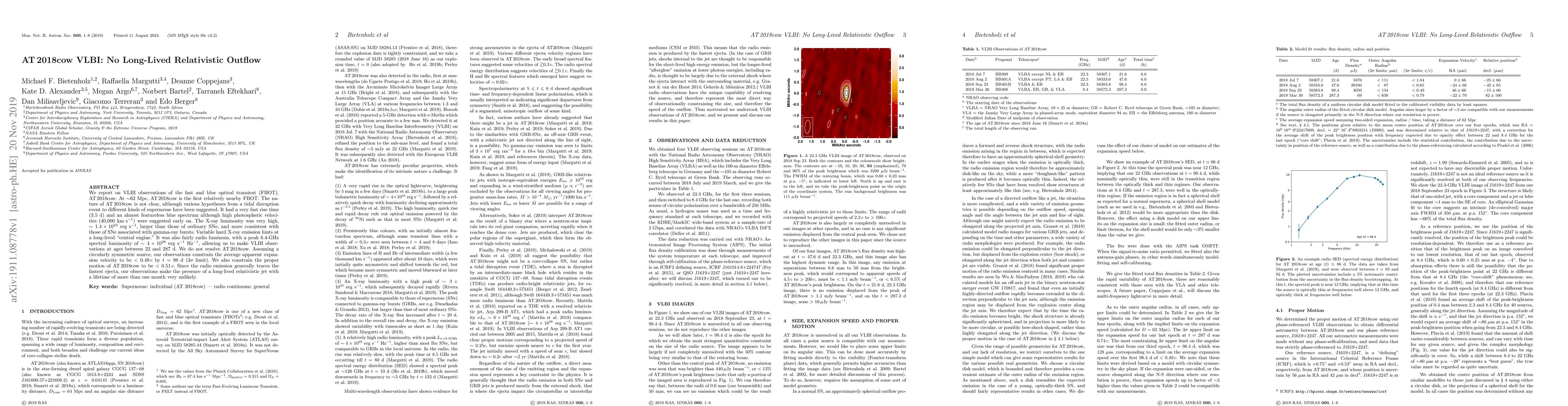 We report on VLBI observations of the fast and blue optical transient (FBOT), AT 2018cow. At ~62 Mpc, AT 2018cow is the first relatively nearby FBOT. The nature of AT 2018cow is not clear, although various hypotheses from a tidal disruption event to different kinds of supernovae have been suggested. It had a very fast rise time (3.5 d) and an almost featureless blue spectrum although high photospheric velocities (40,000 km s$^{-1}$) were suggested early on. The X-ray luminosity was very high, ~$1.4 \times 10^{43}$ erg s$^{-1}$, larger than those of ordinary SNe, and more consistent with those of SNe associated with gamma-ray bursts. Variable hard X-ray emission hints at a long-lived "central engine." It was also fairly radio luminous, with a peak 8.4-GHz spectral luminosity of ~$4 \times 10^{28}$ erg s$^{-1}$ Hz$^{-1}$, allowing us to make VLBI observations at ages between 22 and 287 d. We do not resolve AT 2018cow. Assuming a circularly symmetric source, our observations constrain the average apparent expansion velocity to be <0.49$c$ by t = 98 d (3$\sigma$ limit). We also constrain the proper motion of AT 2018cow to be <0.51$c$. Since the radio emission generally traces the fastest ejecta, our observations make the presence of a long-lived relativistic jet with a lifetime of more than one month very unlikely.