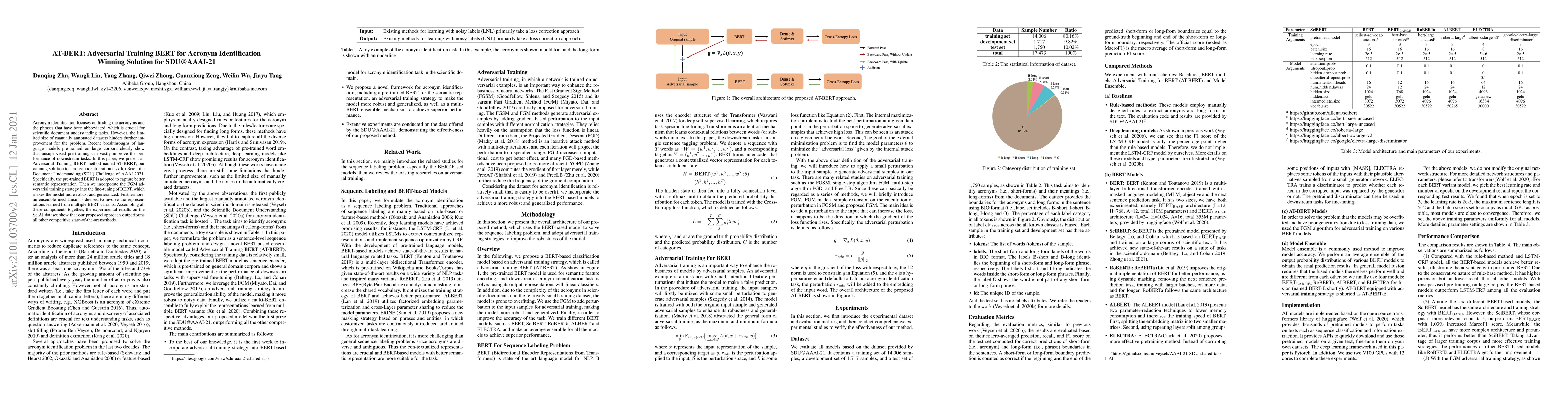 The paper introduces AT-BERT, an Adversarial Training BERT method that enhances acronym identification in scientific documents. By combining BERT's semantic representation with adversarial training and an ensemble mechanism, AT-BERT achieves superior performance in the SDU@AAAI-21 challenge.