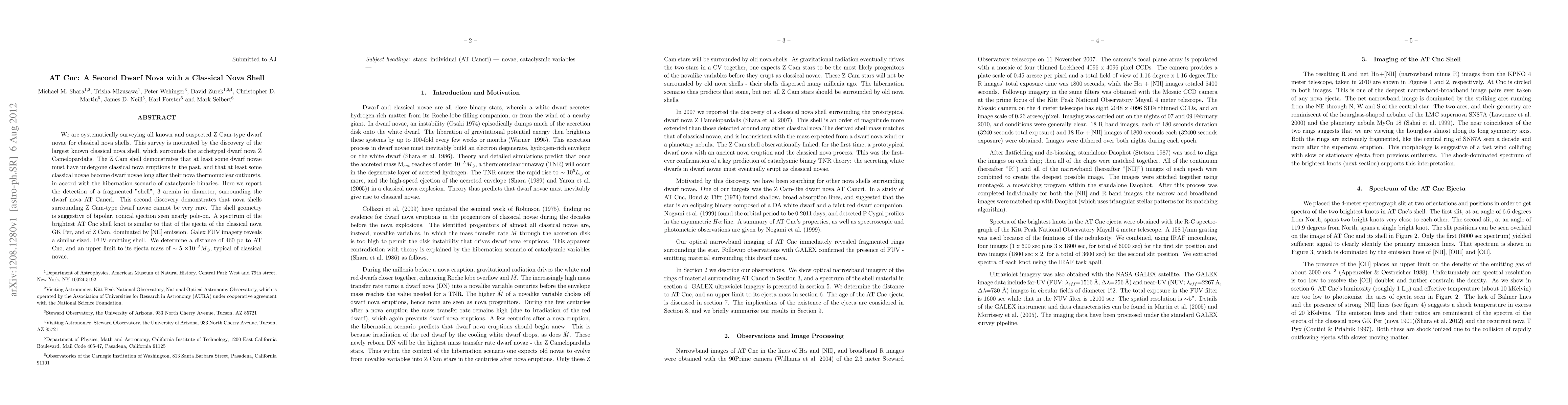 We are systematically surveying all known and suspected Z Cam-type dwarf novae for classical nova shells. This survey is motivated by the discovery of the largest known classical nova shell, which surrounds the archetypal dwarf nova Z Camelopardalis. The Z Cam shell demonstrates that at least some dwarf novae must have undergone classical nova eruptions in the past, and that at least some classical novae become dwarf novae long after their nova thermonuclear outbursts, in accord with the hibernation scenario of cataclysmic binaries. Here we report the detection of a fragmented "shell", 3 arcmin in diameter, surrounding the dwarf nova AT Cancri. This second discovery demonstrates that nova shells surrounding Z Cam-type dwarf novae cannot be very rare. The shell geometry is suggestive of bipolar, conical ejection seen nearly pole-on. A spectrum of the brightest AT Cnc shell knot is similar to that of the ejecta of the classical nova GK Per, and of Z Cam, dominated by [NII] emission. Galex FUV imagery reveals a similar-sized, FUV-emitting shell. We determine a distance of 460 pc to AT Cnc, and an upper limit to its ejecta mass of ~ 5 x 10^{-5} Msun, typical of classical novae.