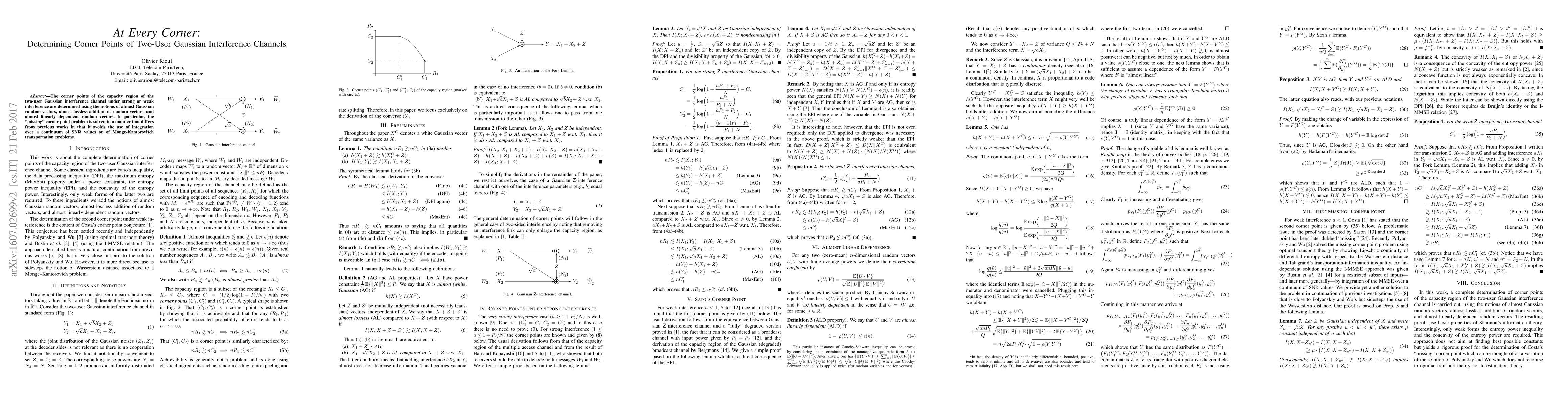The corner points of the capacity region of the two-user Gaussian interference channel under strong or weak interference are determined using the notions of almost Gaussian random vectors, almost lossless addition of random vectors, and almost linearly dependent random vectors. In particular, the "missing" corner point problem is solved in a manner that differs from previous works in that it avoids the use of integration over a continuum of SNR values or of Monge-Kantorovitch transportation problems.