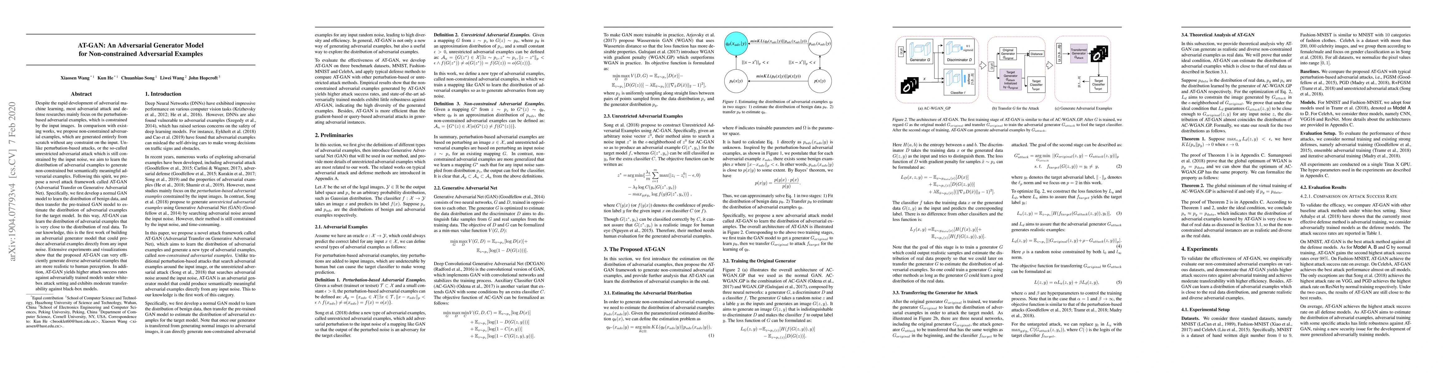 The paper proposes AT-GAN, an adversarial generator model that creates non-constrained adversarial examples from scratch, without input constraints. AT-GAN uses a GAN to learn the distribution of benign data and then transfers this model to generate realistic adversarial examples, achieving higher attack success rates against adversarially trained models and moderate transferability against black-box models.