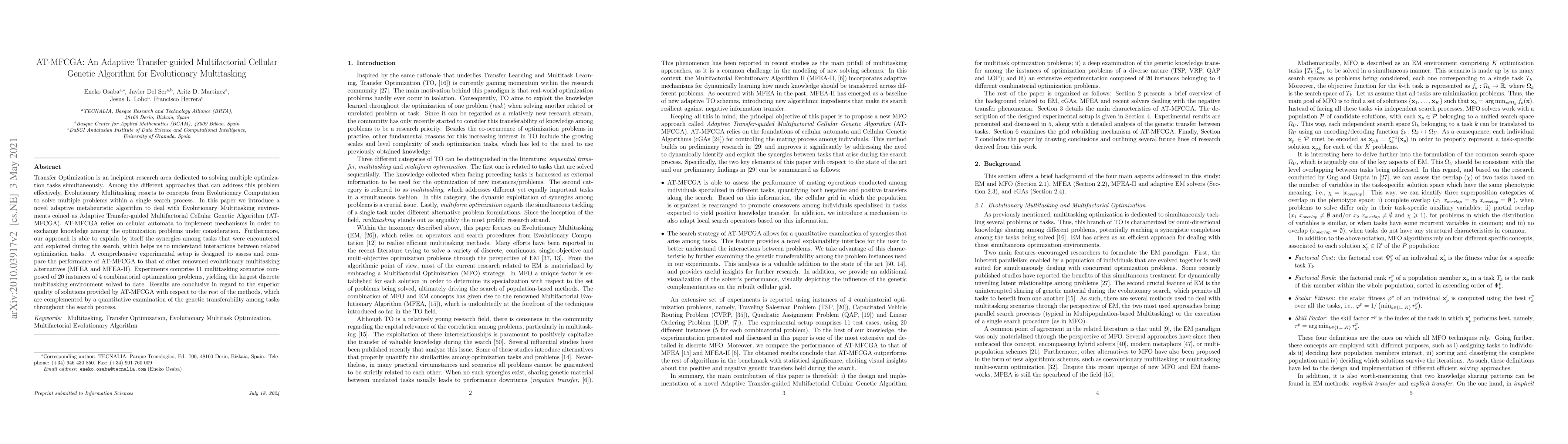 The paper introduces AT-MFCGA, an adaptive metaheuristic algorithm for evolutionary multitasking, which uses cellular automata to share knowledge among optimization problems. Experimental results show AT-MFCGA outperforms other methods, demonstrating superior solution quality and genetic transferability among tasks.