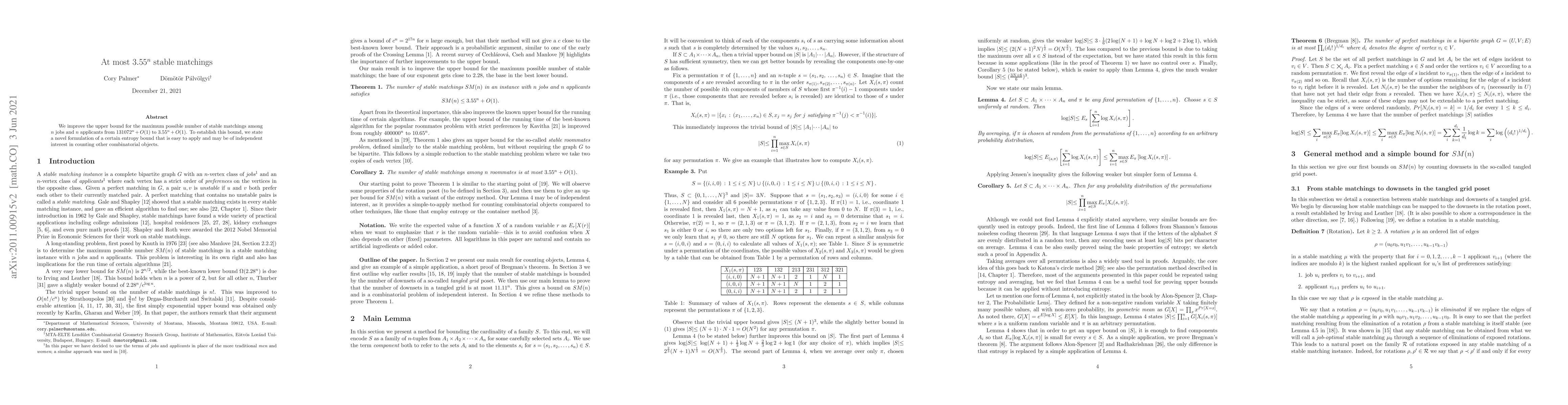 We improve the upper bound for the maximum possible number of stable matchings among $n$ jobs and $n$ applicants from $131072^n+O(1)$ to $3.55^n+O(1)$. To establish this bound, we state a novel formulation of a certain entropy bound that is easy to apply and may be of independent interest in counting other combinatorial objects