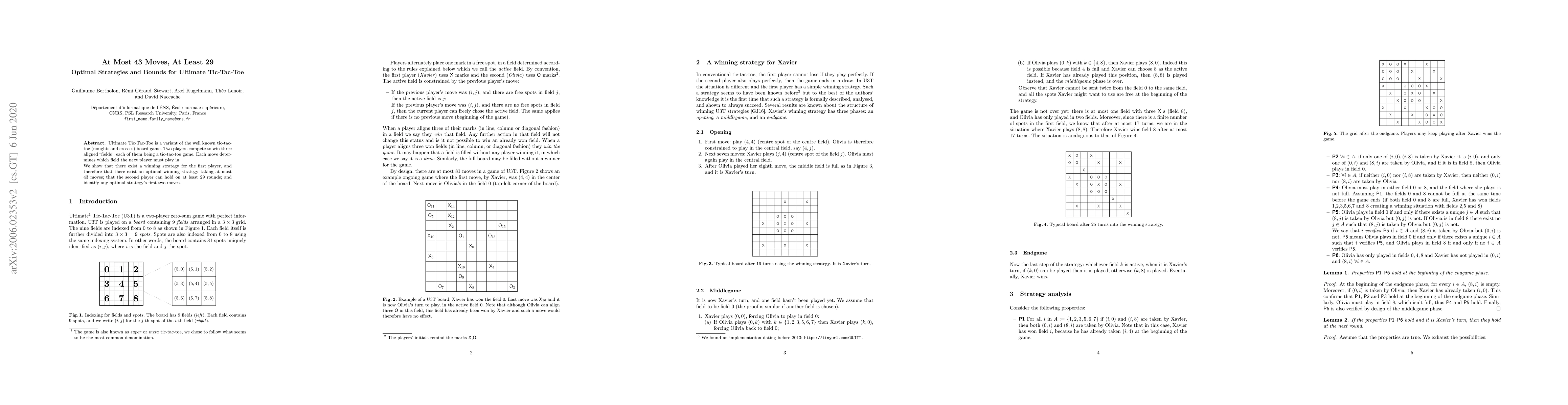 Ultimate Tic-Tac-Toe is a variant of the well known tic-tac-toe (noughts and crosses) board game. Two players compete to win three aligned "fields", each of them being a tic-tac-toe game. Each move determines which field the next player must play in. We show that there exist a winning strategy for the first player, and therefore that there exist an optimal winning strategy taking at most 43 moves; that the second player can hold on at least 29 rounds; and identify any optimal strategy's first two moves.