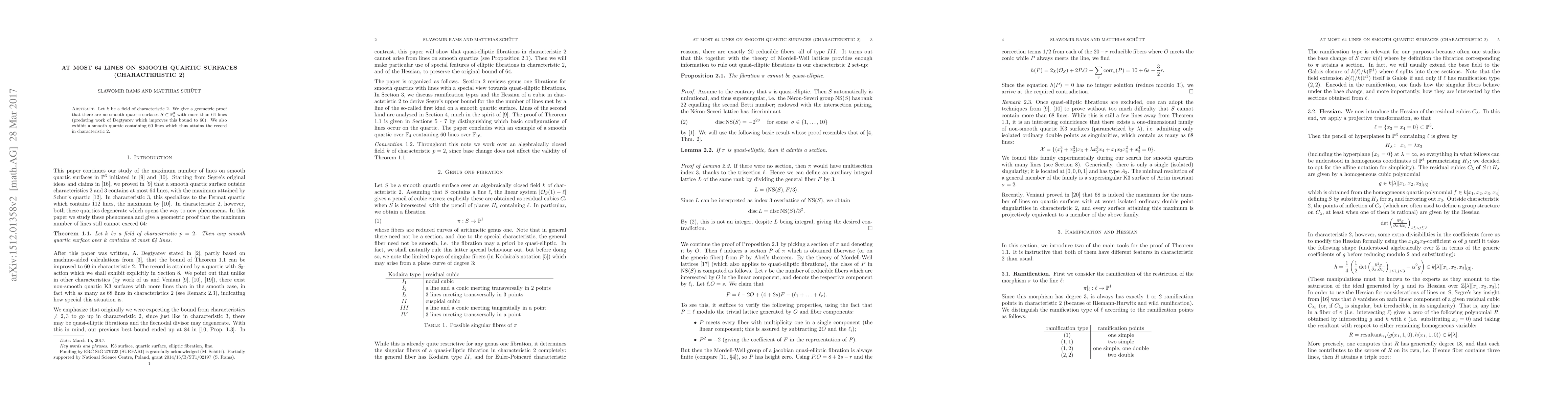 This paper presents a geometric proof showing that smooth quartic surfaces in IP^3 over a field of characteristic 2 cannot contain more than 64 lines, predating a subsequent improvement to 60 lines. It also constructs a smooth quartic surface that contains exactly 60 lines, establishing the maximum in this characteristic.