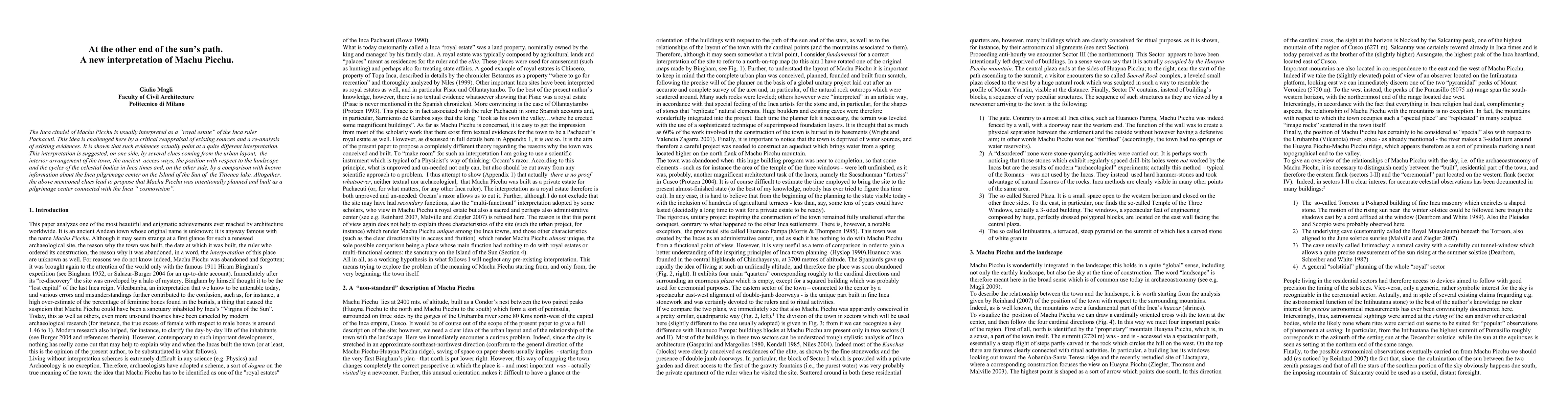 The Inca citadel of Machu Picchu is usually interpreted as a "royal estate" of the Inca ruler Pachacuti. This idea is challenged here by a critical reappraisal of existing sources and a re-analysis of existing evidences. It is shown that such evidences actually point at a quite different interpretation. This interpretation is suggested, on one side, by several clues coming from the urban layout, the interior arrangement of the town, the ancient access ways, the position with respect to the landscape and the cycles of the celestial bodies in Inca times and, on the other side, by a comparison with known information about the Inca pilgrimage center on the Island of the Sun of the Titicaca lake. Altogether, the abovementioned clues lead to propose that Machu Picchu was intentionally planned and built as a pilgrimage center connected with the Inca "cosmovision".