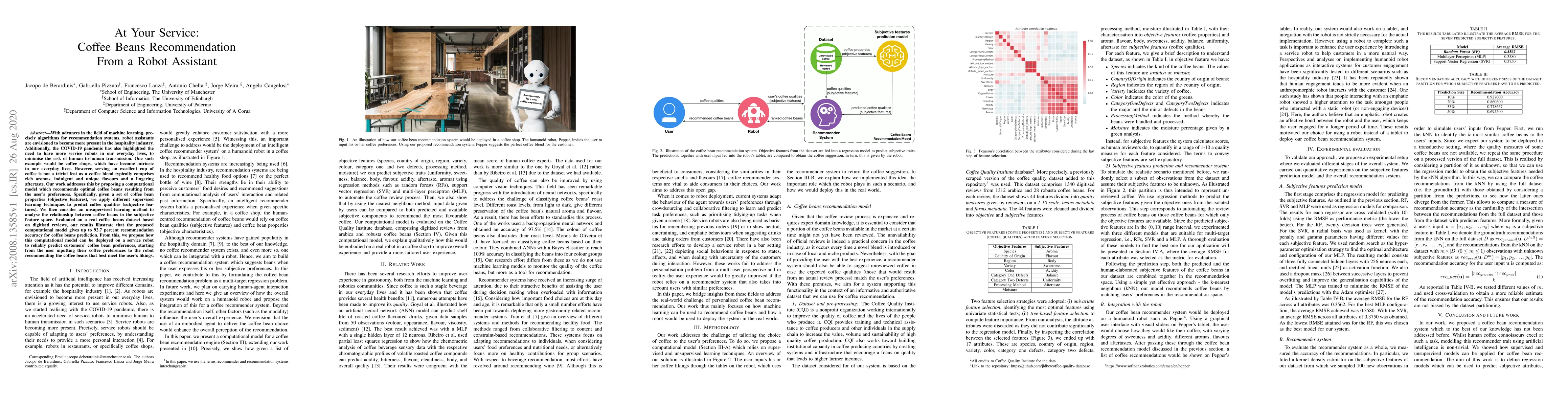 With advances in the field of machine learning, precisely algorithms for recommendation systems, robot assistants are envisioned to become more present in the hospitality industry. Additionally, the COVID-19 pandemic has also highlighted the need to have more service robots in our everyday lives, to minimise the risk of human to-human transmission. One such example would be coffee shops, which have become intrinsic to our everyday lives. However, serving an excellent cup of coffee is not a trivial feat as a coffee blend typically comprises rich aromas, indulgent and unique flavours and a lingering aftertaste. Our work addresses this by proposing a computational model which recommends optimal coffee beans resulting from the user's preferences. Specifically, given a set of coffee bean properties (objective features), we apply different supervised learning techniques to predict coffee qualities (subjective features). We then consider an unsupervised learning method to analyse the relationship between coffee beans in the subjective feature space. Evaluated on a real coffee beans dataset based on digitised reviews, our results illustrate that the proposed computational model gives up to 92.7 percent recommendation accuracy for coffee beans prediction. From this, we propose how this computational model can be deployed on a service robot to reliably predict customers' coffee bean preferences, starting from the user inputting their coffee preferences to the robot recommending the coffee beans that best meet the user's likings.