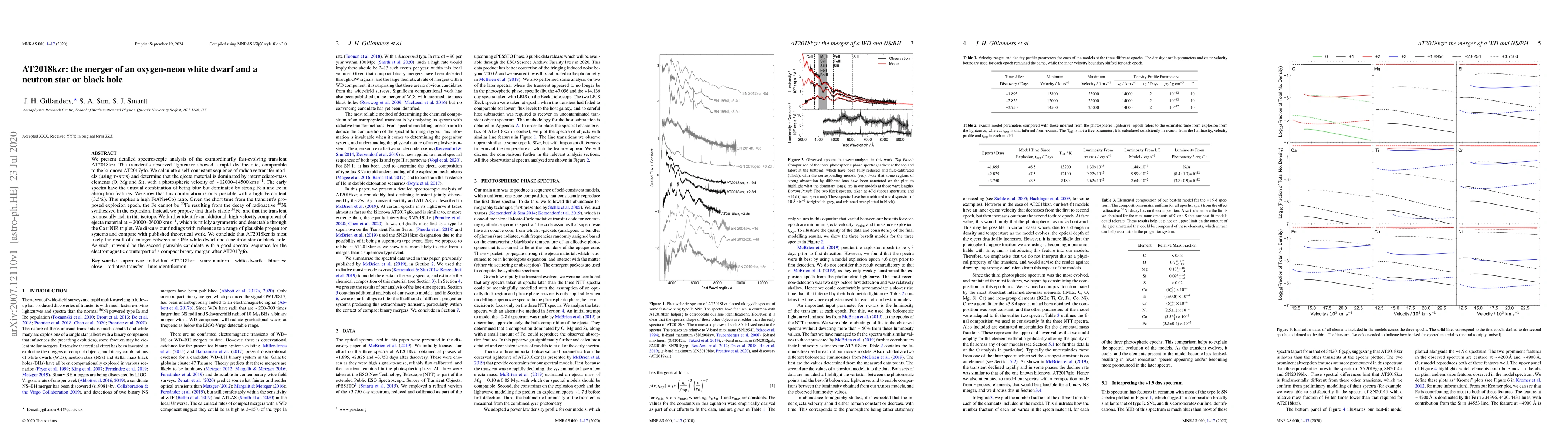 The AT2018kzr transient is likely the result of a merger between an oxygen-neon white dwarf and a neutron star or black hole, with a unique spectral signature dominated by intermediate-mass elements and high-velocity iron isotopes.