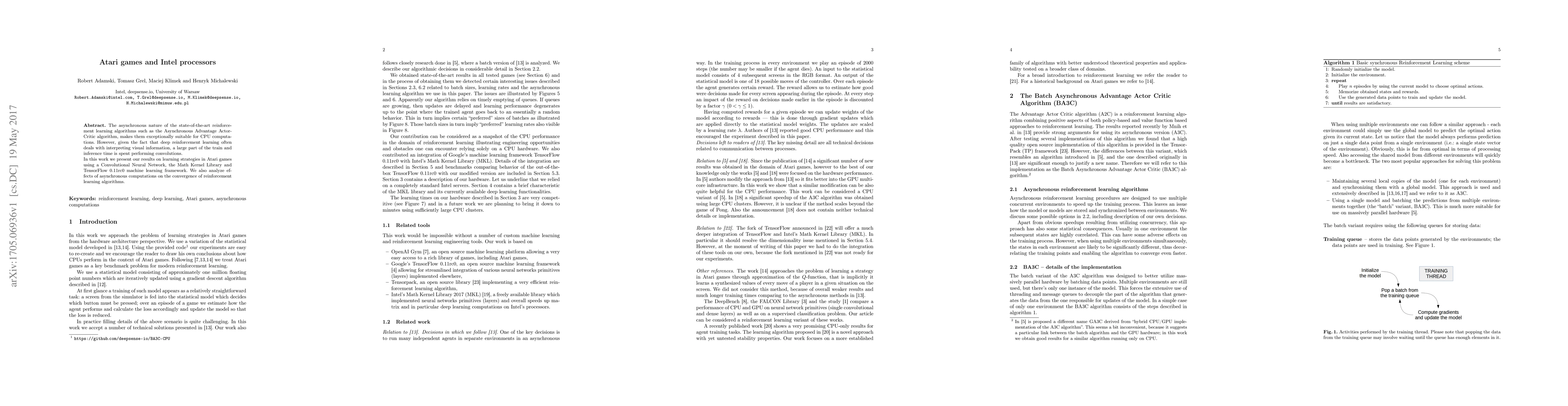 This paper explores the use of asynchronous reinforcement learning algorithms on Intel processors for training Convolutional Neural Networks to play Atari games, highlighting the impact of asynchronous computations on algorithm convergence and performance. The study leverages the Math Kernel Library and TensorFlow for efficient convolution operations.