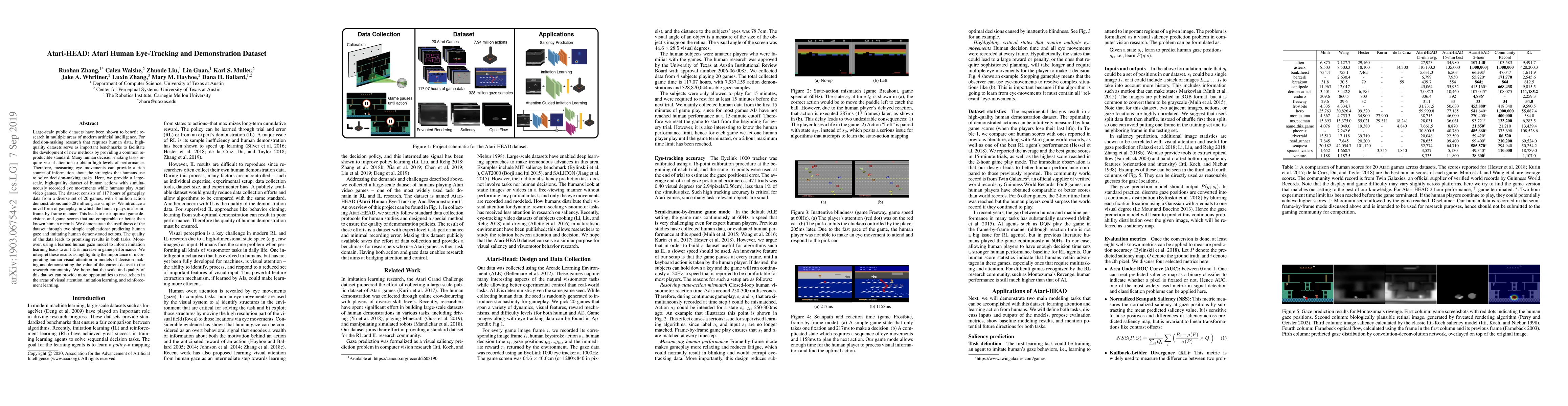 The Atari-HEAD dataset records human eye movements and actions during Atari gameplay, providing 117 hours of data from 20 games. It demonstrates the value of human visual attention in decision-making, showing improved game performance through gaze-informed imitation learning.