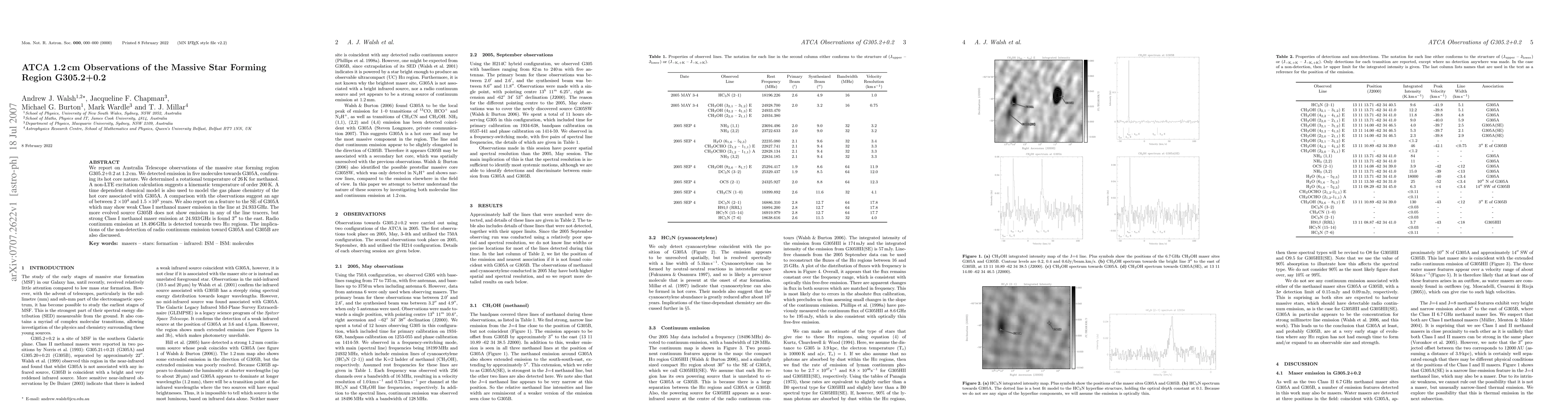 We report on Australia Telescope observations of the massive star forming region G305.2+0.2 at 1.2 cm. We detected emission in five molecules towards G305A, confirming its hot core nature. We determined a rotational temperature of 26 K for methanol. A non-LTE excitation calculation suggests a kinematic temperature of order 200 K. A time dependent chemical model is also used to model the gas phase chemistry of the hot core associated with G305A. A comparison with the observations suggest an age of between 2 x10^4 and 1.5 x10^5 years. We also report on a feature to the SE of G305A which may show weak Class I methanol maser emission in the line at 24.933 GHz. The more evolved source G305B does not show emission in any of the line tracers, but strong Class I methanol maser emission at 24.933 GHz is found 3\arcsec to the east. Radio continuum emission at 18.496 GHz is detected towards two \hii regions. The implications of the non-detection of radio continuum emission toward G305A and G305B are also discussed.