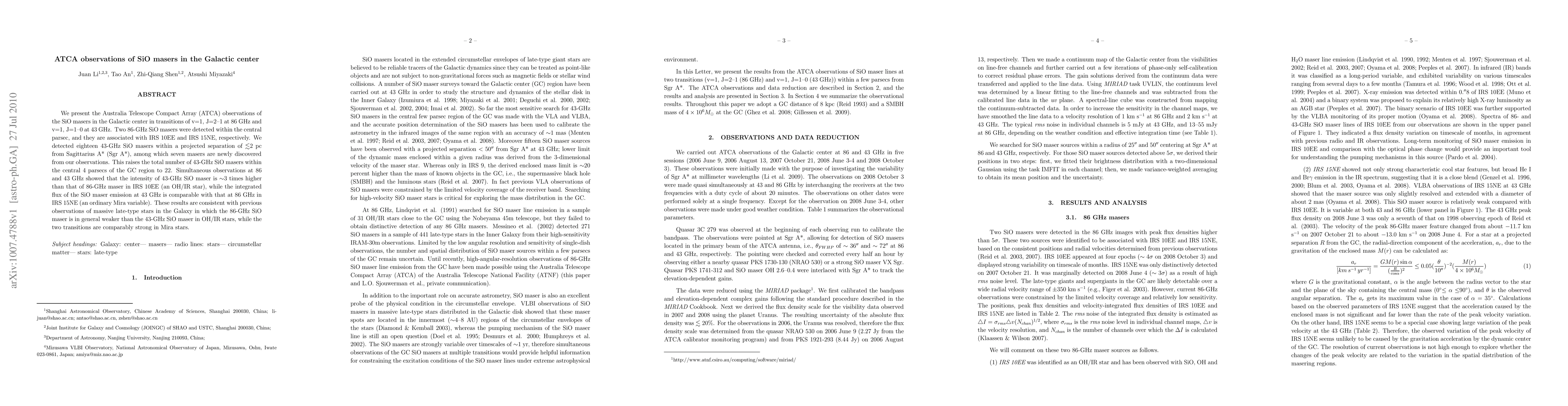 This paper reports ATCA observations of SiO masers in the Galactic center, detecting two 86-GHz and eighteen 43-GHz masers, including seven new discoveries. The study reveals differing intensities between 86 and 43 GHz transitions in OH/IR and Mira stars, consistent with previous findings.