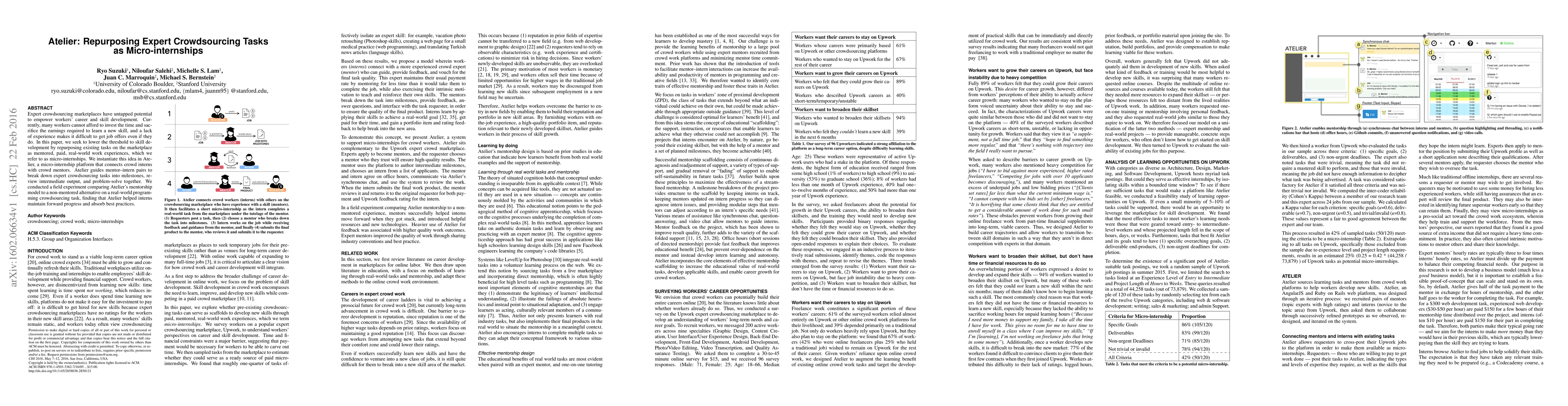 This paper introduces Atelier, a platform that repurposes expert crowdsourcing tasks into micro-internships, connecting crowd interns with mentors to provide guided, paid real-world experiences. A field experiment showed that Atelier's mentorship model helped interns maintain progress and learn best practices compared to a non-mentored approach.
