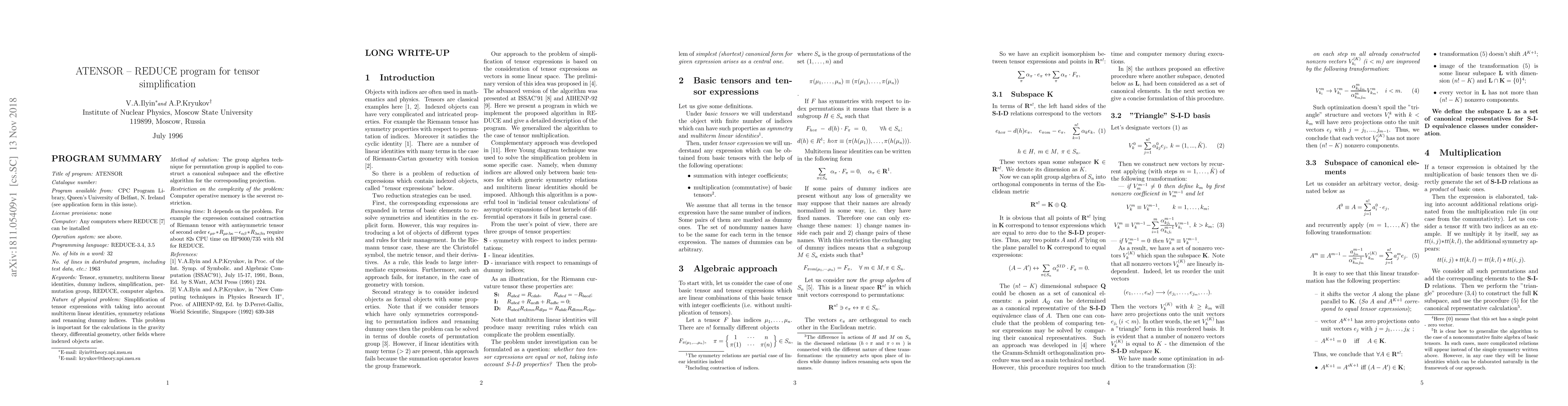 The paper introduces a REDUCE program for simplifying tensor expressions by treating them as vectors in a linear space derived from the group algebra, enabling uniform simplification of symmetric tensors and multiterm identities. The main limitation is the dimension of the linear space, which scales factorially with the number of indices.