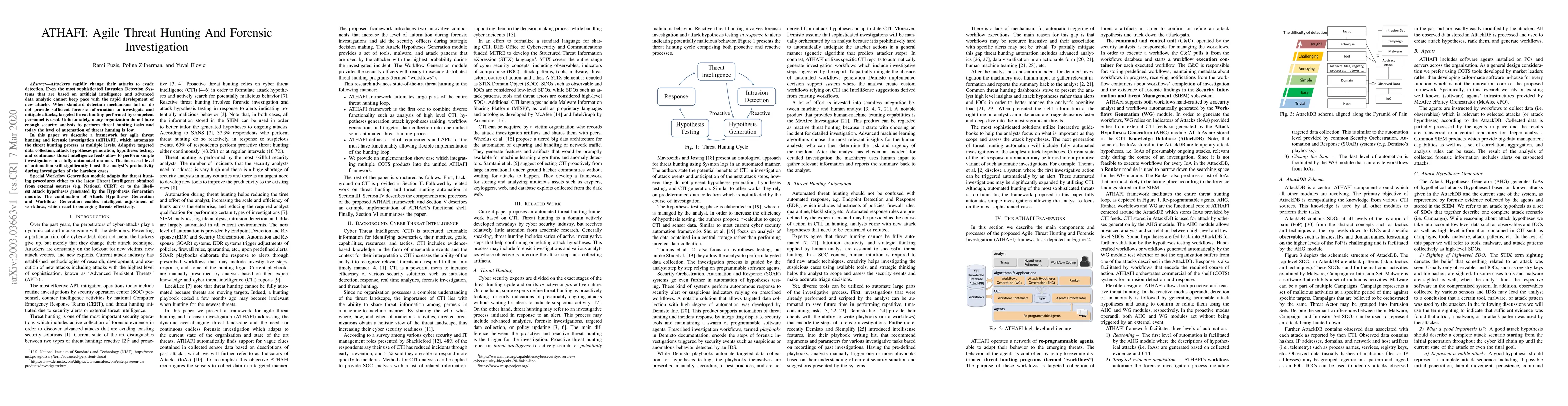 This paper introduces ATHAFI, a framework for automating agile threat hunting and forensic investigation to keep pace with rapidly evolving attacks. It enhances analyst productivity through adaptive data collection, hypothesis generation, testing, and continuous threat intelligence integration.